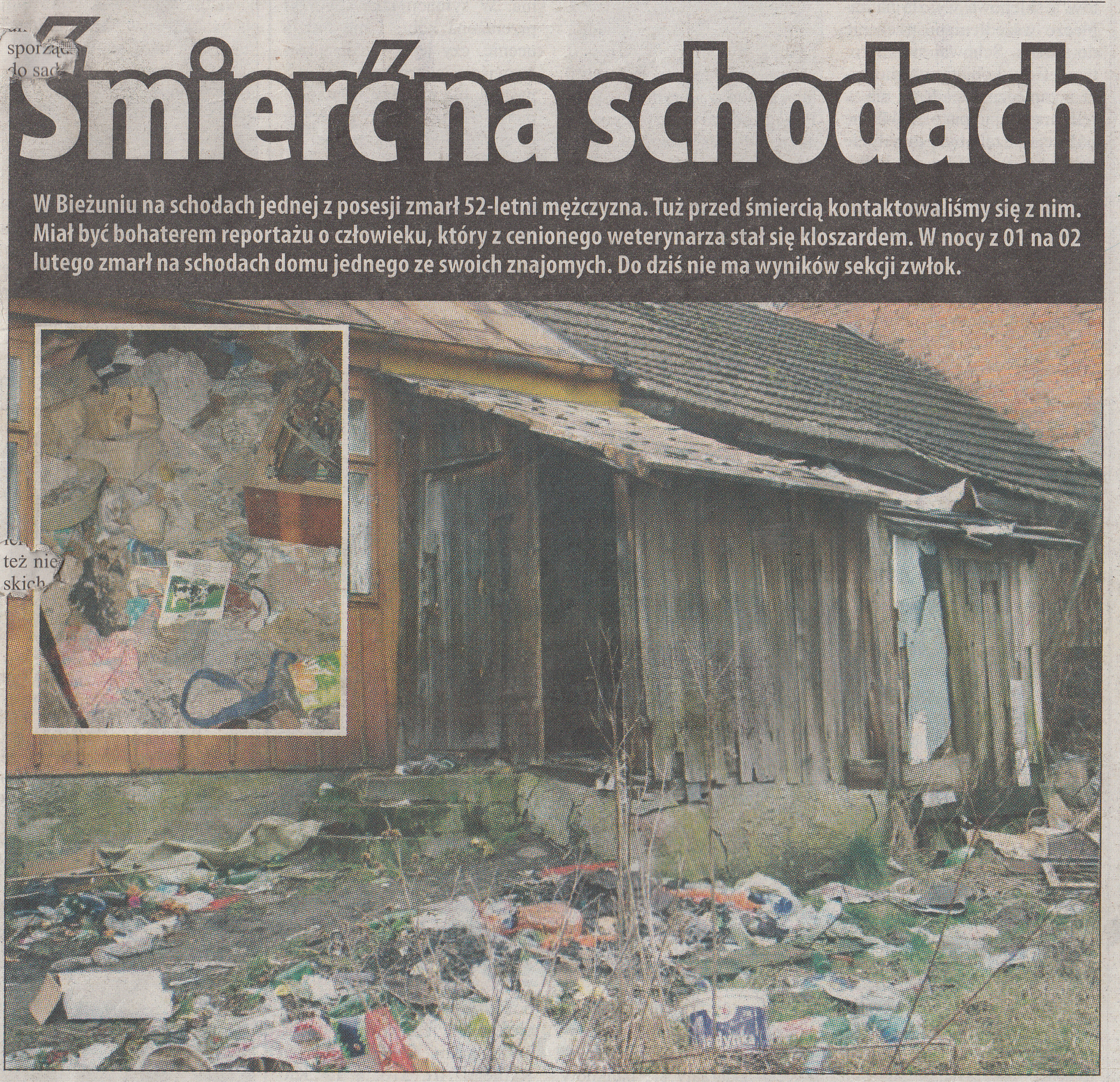 W Bieżuniu na schodach jednej z posesji zmarł 52 – letni mężczyzna. Tuż przed śmiercią redakcja Kuriera Żuromińskiego kontaktowała się z nim. Miał być bohaterem reportażu o człowieku, który z cenionego weterynarza stał się kloszardem. W nocy z 1 na 2 lutego zmarł na schodach domu jednego ze swoich znajomych.