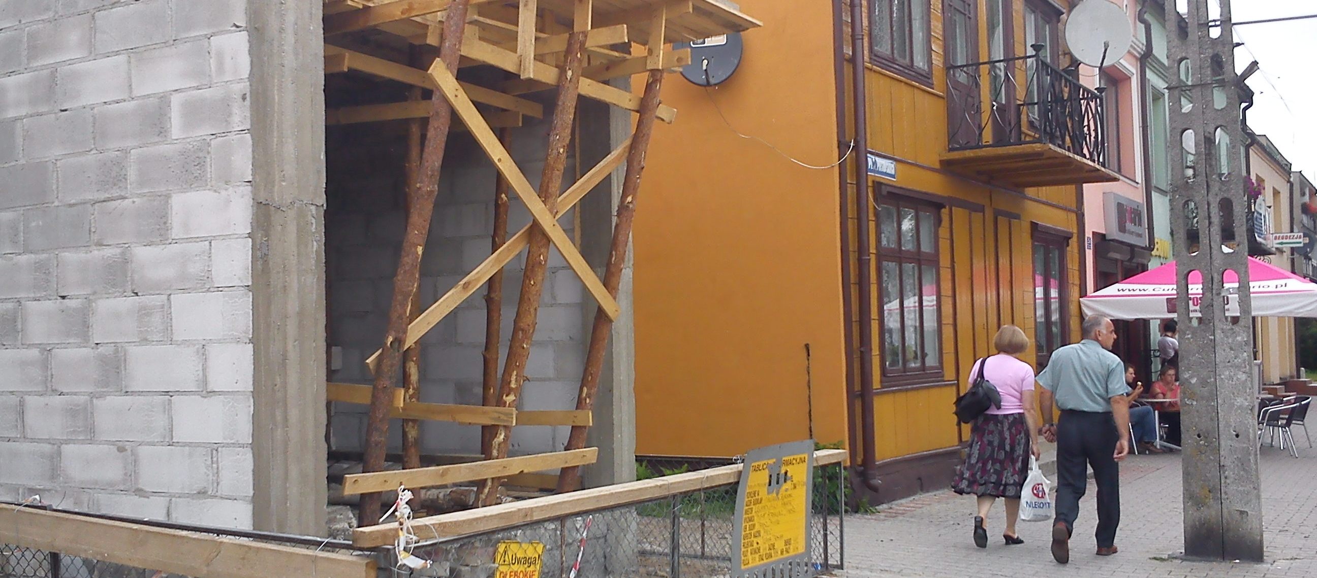 Spór między inwestorem a właścicielami sąsiadujących działek rozpoczął się kilka lat temu, gdy dowiedzieli się oni o planach budowlanych w swoim sąsiedztwie. Przy Placu Piłsudskiego pomiędzy apteką a starym, żółtym, drewnianym domem miał powstać pawilon handlowy. Zdaniem sąsiadów budowa znacznie utrudniałaby korzystanie z ich nieruchomości . Aktualnie budowa została wstrzymana. Po kontroli Powiatowego Inspektoratu Budowlanego okazało się, że inwestycja odbiega od projektu.