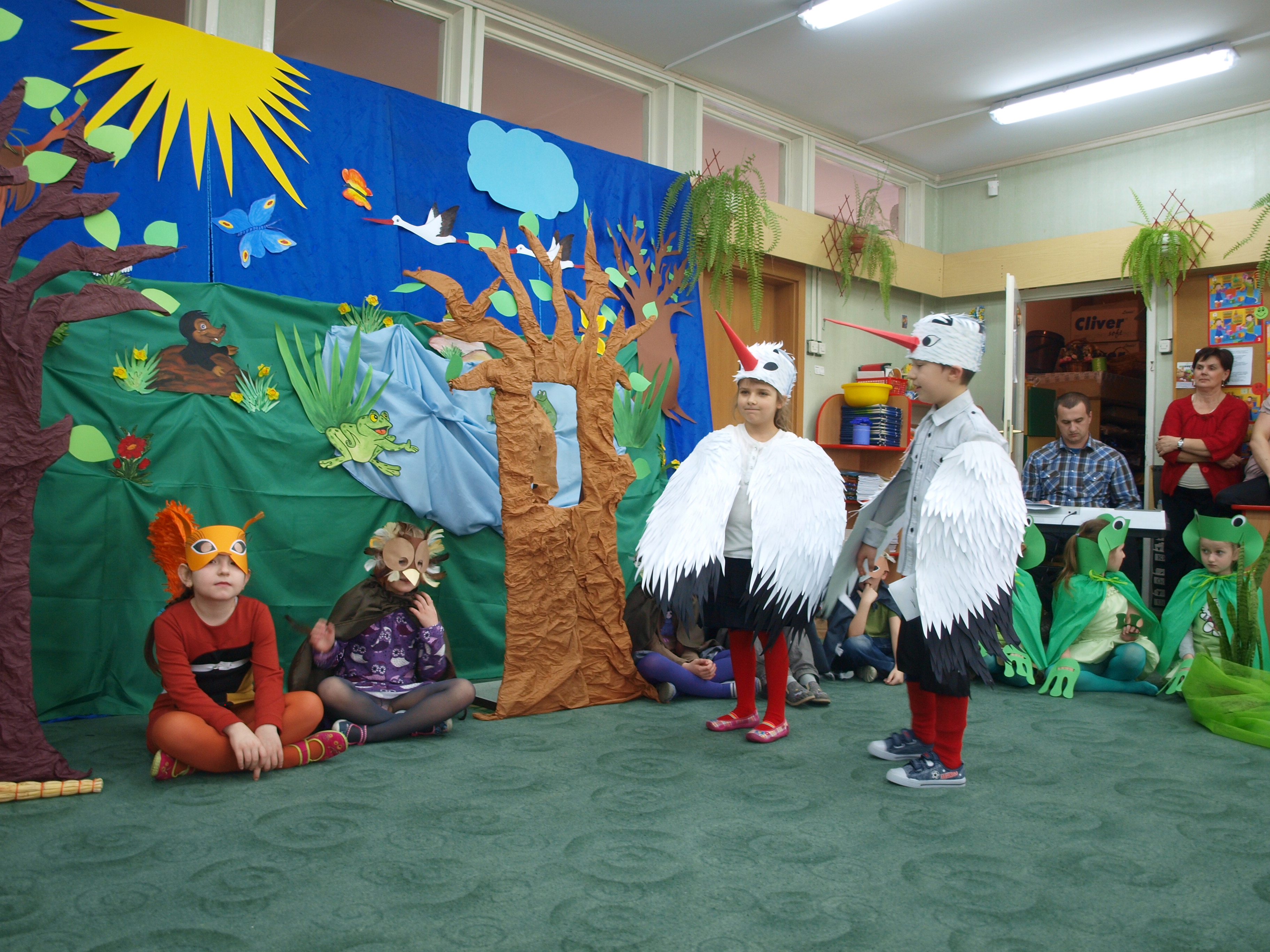 Dzieci w kolorowych strojach wiewiórek, zająców, żab, bocianów i Pani Wiosny pokazały las zupełnie z innej strony i na wesoło. Sześciolatki popisały się dużym talentem aktorskim i wykazały ogromną pamięcią. Teksty, które dzieci recytowały bez zająknięcia, pewnie dla niejednego zawodowego aktora były by trudne do zapamiętania. Bez widocznego stresu i z uśmiechem na twarzy, przeprowadziły widownie przez kilkudziesięciominutową inscenizację. Dzieci do przedstawienia przygotowała Krystyna Topolewska.