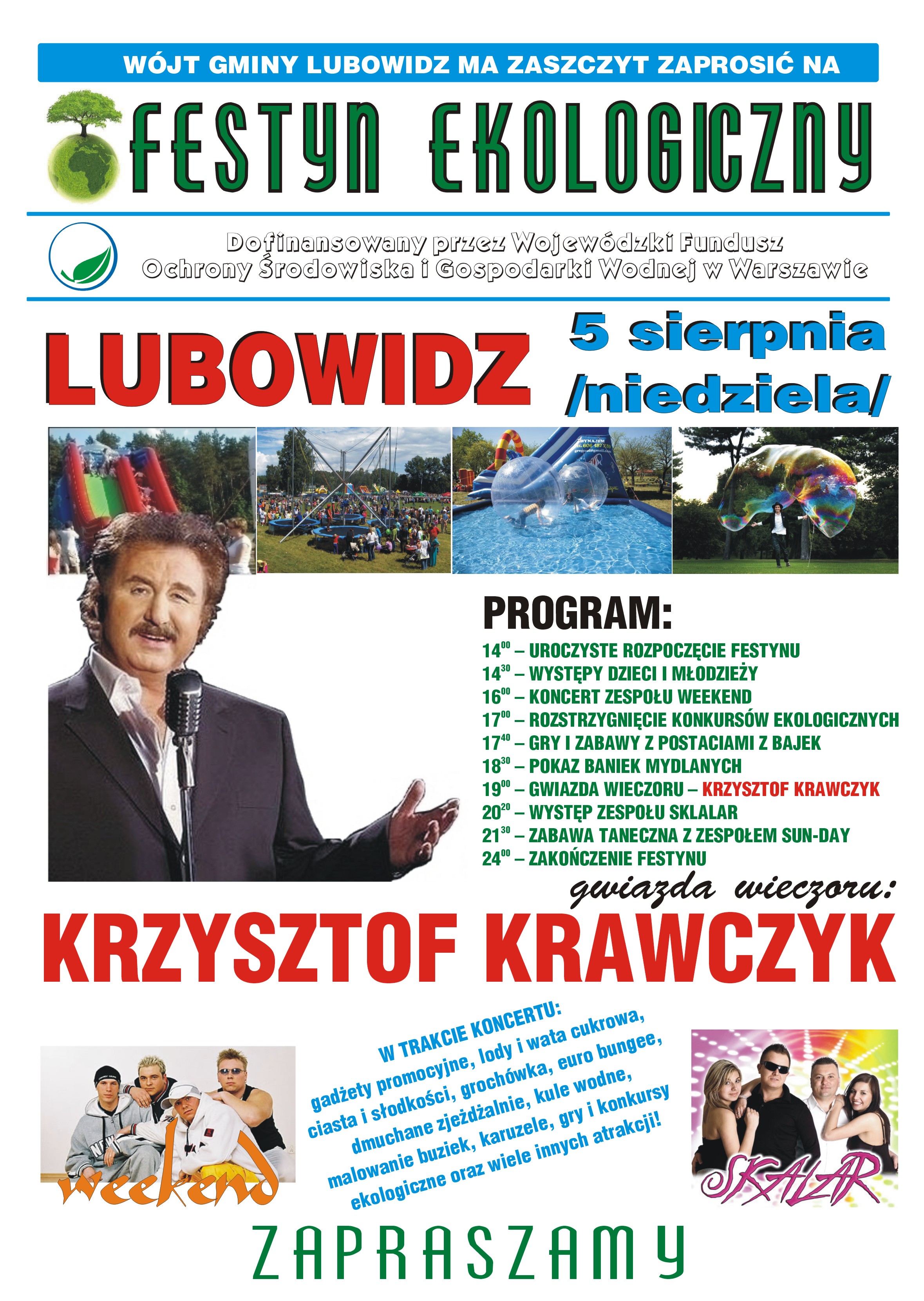 W programie znalazły się występy dzieci i młodzieży, gry i zabawy z postaciami z bajek, pokaz baniek mydlanych. Odbywać się będą konkursy ekologiczne. Zagrają również zespoły Weekend, Sun – Day i Skalar. W czasie trwania festynu będzie można skorzystać z wielu atrakcji: dmuchanych zjeżdżalni, kuli wodnych, karuzeli, malowania buzi i wielu innych. Około godziny 19:00 wystąpi gwiazda wieczoru Krzysztof Krawczyk.
