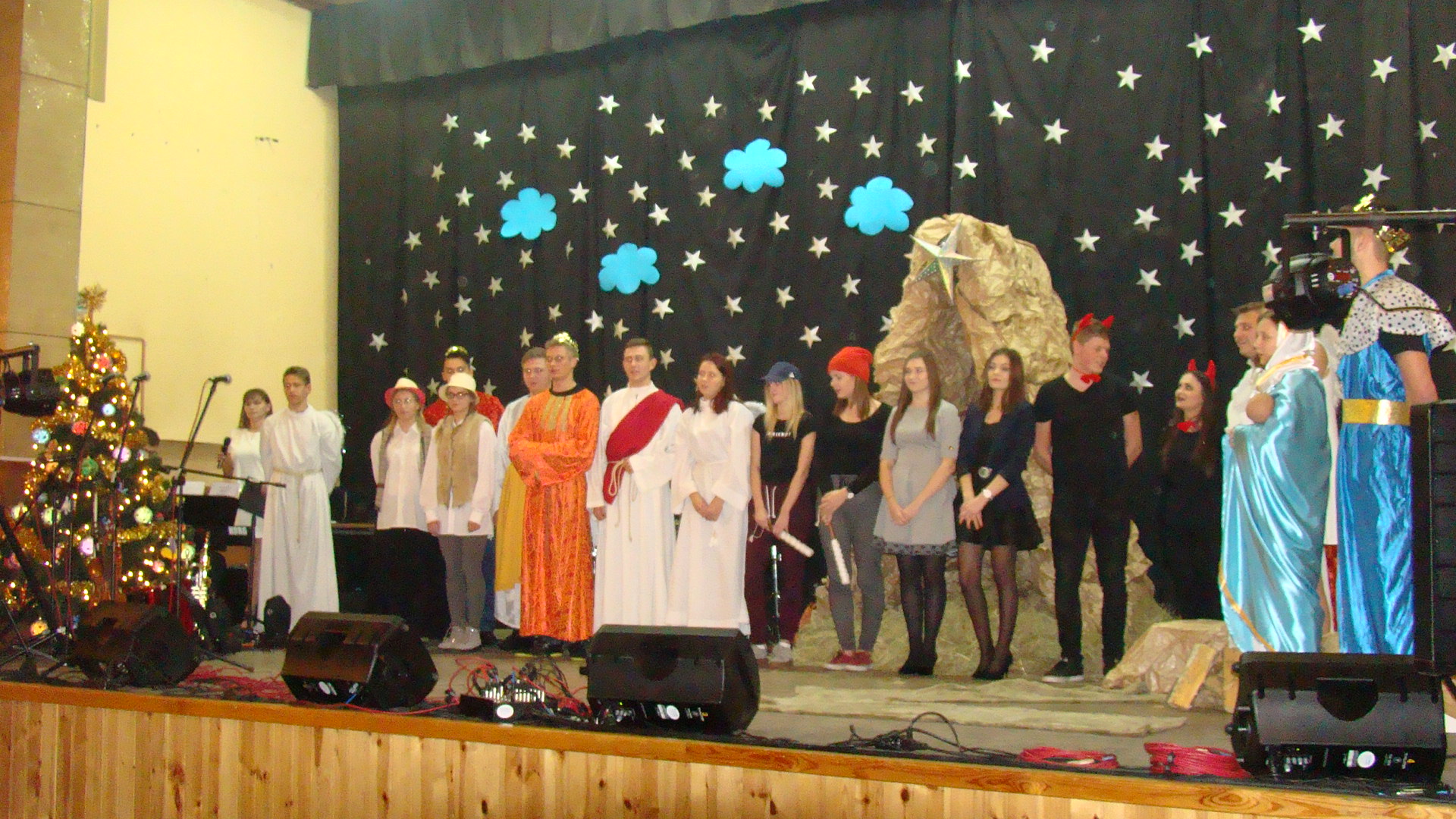 Wśród nich byli między innymi starosta Jerzy Rzymowski, burmistrz Andrzej Szymański, radni oraz mieszkańcy Bieżunia i okolic. Po raz kolejny uczniowie klas pierwszych i drugich Liceum Ogólnokształcącego im. Władysława Orkana pod kierownictwem proboszcza ks Tomasza Ozimkowskiego i psycholog Moniki Majerskiej zaprezentowali Jasełka Bożonarodzeniowe. Oprócz tradycyjnych motywów związanych z historią narodzenia Jezusa nie zabrakło w niej nowoczesnych, kiedy to aktorzy posługują się telefonami komórkowymi czy w tekst wplecione są współczesne wydarzenia. Oprócz Heroda ubranego w elegancki garnitur a zagranego przez Aleksandra Osieckiego, wystąpiły postacie „dresiarzy” zagrane przez Weronikę Sliwińską i Sylwię Jakubczyk czy Diabeł Rokita w którego wcieliła się Aleksandra Plewka. – Nigdy nie chodzę na próby i dziś po raz pierwszy miałem okazję zobaczyć występ za które należą się słowa uznania. To kawał dobrej roboty i cieszę się że od czterech lat kontynuuje się jasełkową tradycję a frekwencja na widowni bardzo mnie zaskoczyła – mówi dyrektor liceum Krzysztof Jabłoński. – Mam nadzieję, że aktorzy mają zapewnioną „szóstkę” z religii i polskiego – dodaje z uśmiechem burmistrz Andrzej Szymański który za kulisami złożył serdeczne gratulacje młodzieży. Czy łatwo wplata się w tradycyjny tekst współczesne elementy z naszej codzienności? – Nie jest to takie proste – mówi ks Ozimkowski, bo nie raz jest taka obawa, że widzowie nie są w stanie do końca zrozumieć nasze intencje zawarte w jasełkach. Staraliśmy się jednak tak wszystko dobrać aby to było zrozumiałe dla wszystkich i to w mojej ocenie udało się – dodaje ks Tomasz rozdając tabliczki czekolady młodym aktorom. A jak trwały przygotowania do występów? – Bardzo duże zaangażowanie młodzieży przy wsparciu nauczycieli oraz możliwość wykazania swoich nieraz ukrytych talentów to właściwie cała tajemnicy osiągniętego sukcesu, bo brawa w trakcie występów jak i na końcu są tego dowodem. Wszystkim bez wyjątku młodym aktorom składam wielkie podziękowania – podsumowuje Monik Majerska. Jasełkowe spotkanie dzięki Małgorzacie Kraśniewskiej – zakończył koncert kolęd i pastorałek zespołu „Moja Rodzina” a złożonego w stu procentach z rodziny Wiśniewskich z Glinojecka.