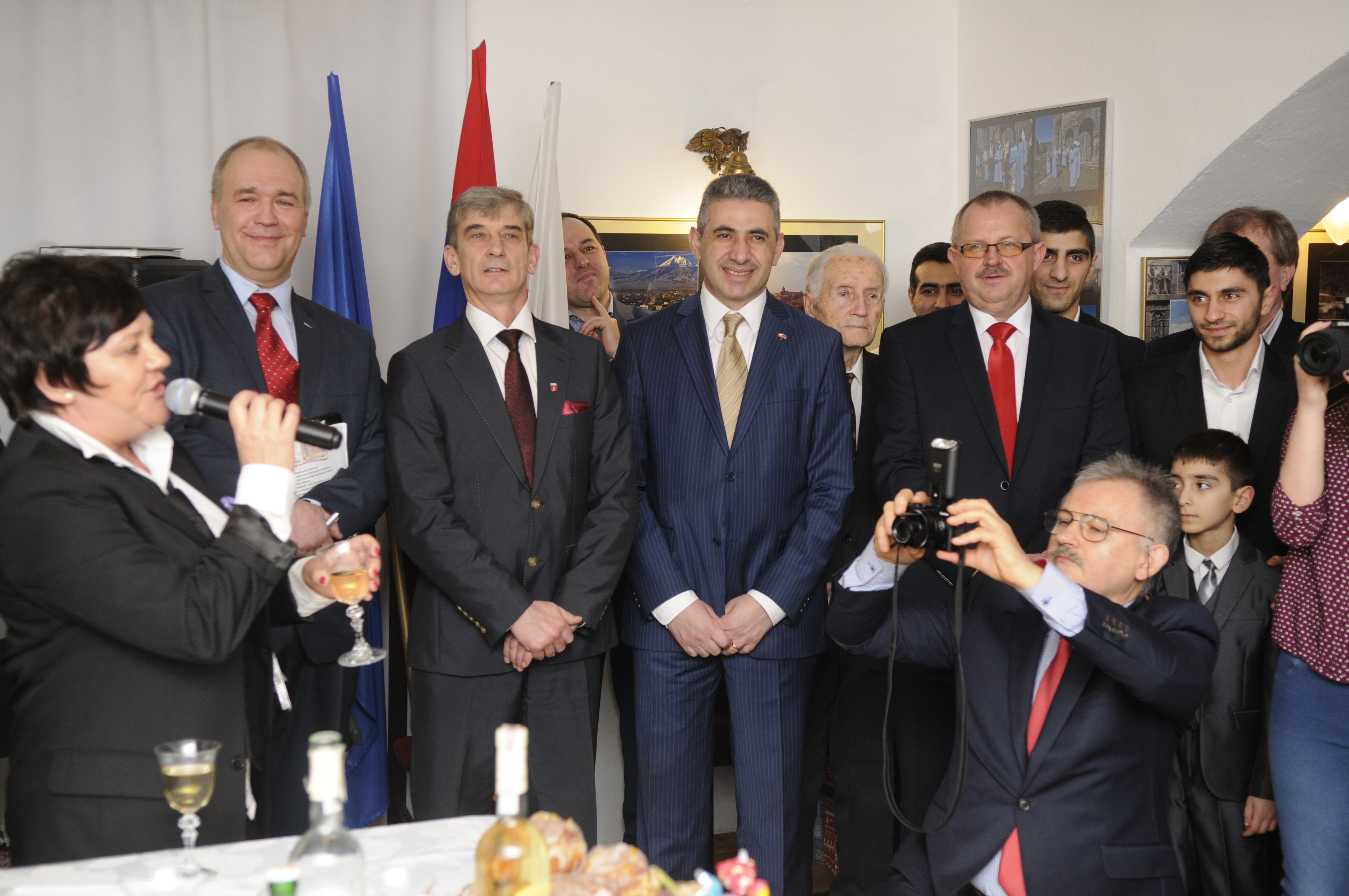 Licznie przybyłych tego wieczoru gości z Warszawy, Mławy, Sierpca, Lublina, Giżycka, Opinogóry, Zielonej, Grudziądza, Golubia Dobrzynia, Radzanowa, Malużyna, Czernikowa, Żuromina i oczywiście z Bieżunia przywitał w imieniu organizatorów kierownik Oddziału Jerzy Piotrowski. Szczególnie gorąco powitany został Ambasador Armenii w Warszawie Jego Ekscelencja Edgar Ghazaryan – Honorowy Patron naszego projektu, który przybył do Bieżunia z małżonką Marianną oraz trojgiem dzieci i mamą, a także konsul ambasady Tigran Vardanyan z małżonką i dzieckiem. Ambasador podziękował organizatorom za przygotowanie wystawy oraz Wieczoru Ormiańskiego w Bieżuniu. Wystąpienie to tłumaczyła przysięgła tłumacz języka ormiańskiego Pani Lilit Karapetyan, która przybyła do Bieżunia również z rodziną. Głos zabrali także burmistrz Miasta i Gminy Bieżuń Andrzej Szymański, starosta żuromiński Jerzy Rzymowski oraz poseł na Sejm RP Waldemar Olejniczak, którzy przekazali gościom okolicznościowe prezenty.