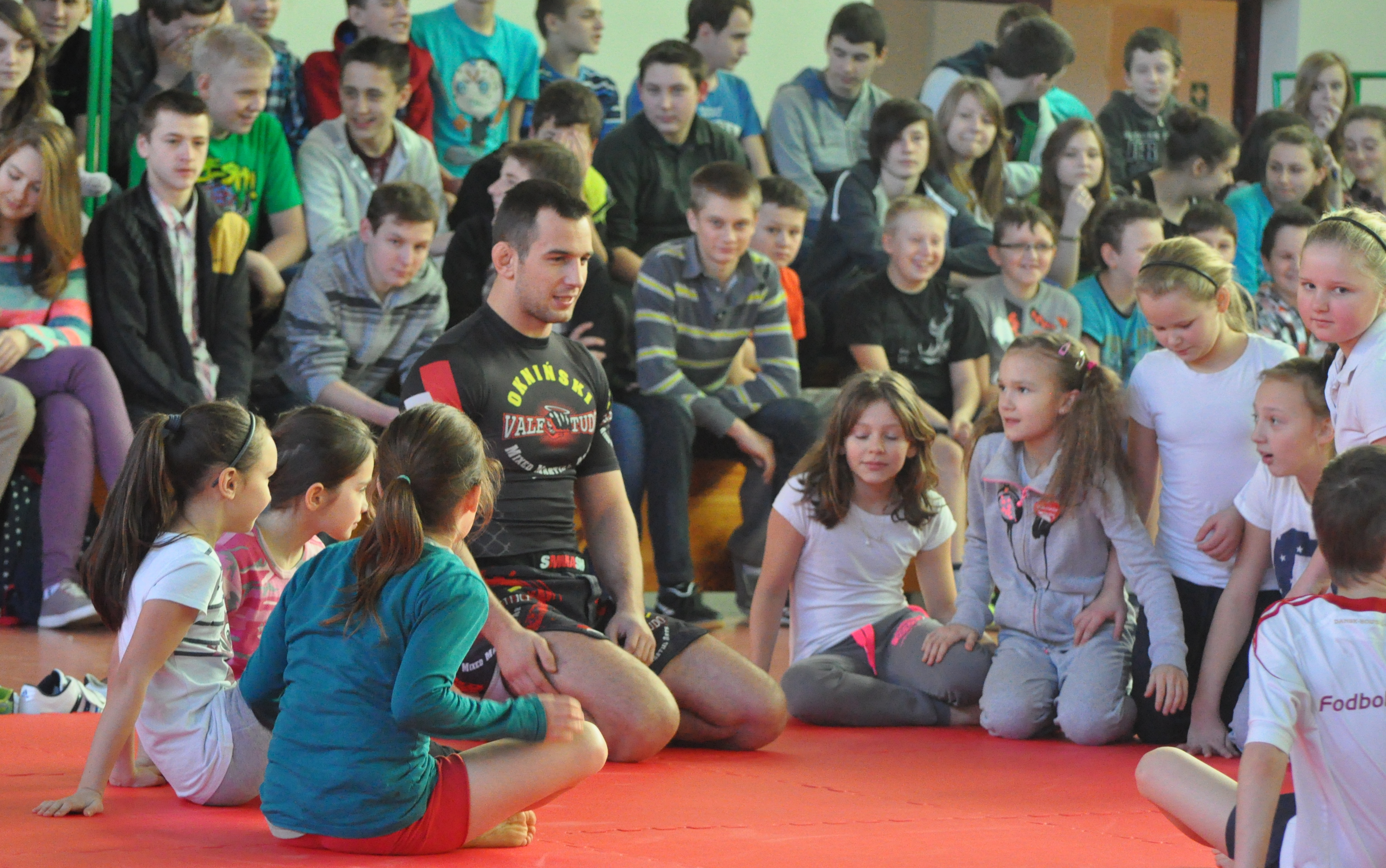 Później mistrz MMA poprowadził pokazową rozgrzewkę wraz z uczniami ze szkoły podstawowej.