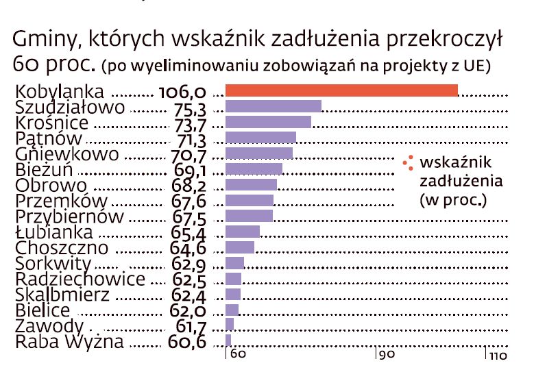 Portal podaje informację, że zadłużenie Bieżunia wynosi 69,1%. Rekordzistą w rankingu jest Kobylanka z zadłużeniem w wysokości 106 %. Według portalu ponad 60% zadłużenie ma 68 gmin w Polsce.[img]https://[/img]