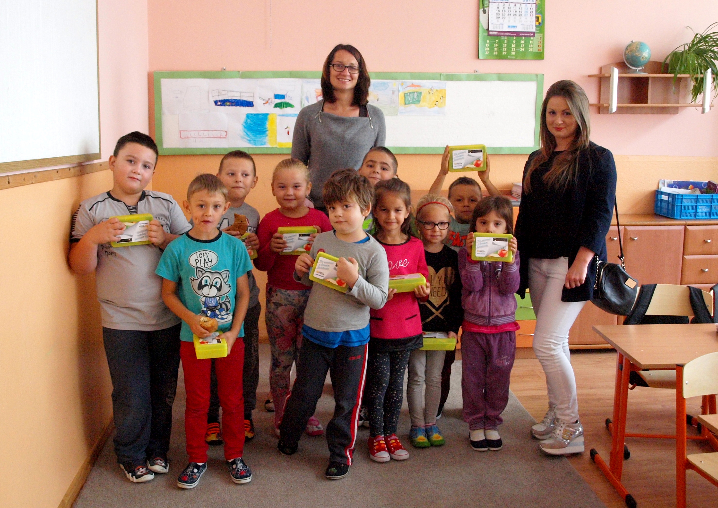 Uczniowie klasy pierwszej Szkoły Podstawowej w Poniatowie: Konrad Cyrankowski, Błażej Kamiński, Agata Kaniecka, Anna Kaniecka, Aleksandra Mync, Kamil Orłowski, Wiktoria Sadowska, Julia Suchoparska, Amelia Trojakowska, Natalia Watkowska, Julia Więckiewicz, Kacper Zaborny ze sponsorami „śniadanek”, panią Moniką Filaszkiewicz i panem Marcinem Serafińskim (wychowawczynią klasy jest pani Danuta Antosiak).