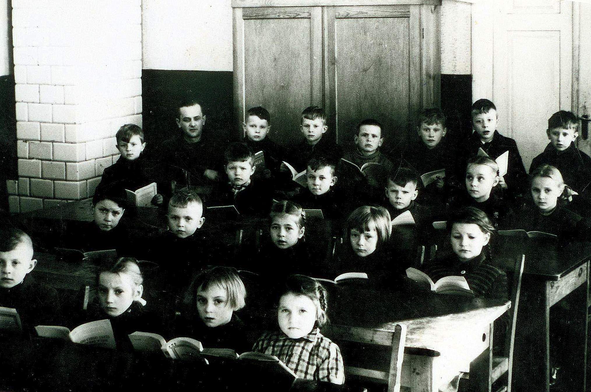 „…Ruszyłem do Żuromina (…) moi bracia już w szkole mieli swoje miejsce w wielkich ławach przeznaczonych dla uczniów. Dla mnie jednak w nich miejsca zabrakło. Przy ścianie z mapą wstawiono małą ławeczkę. Dla mnie i dla nauczyciela.