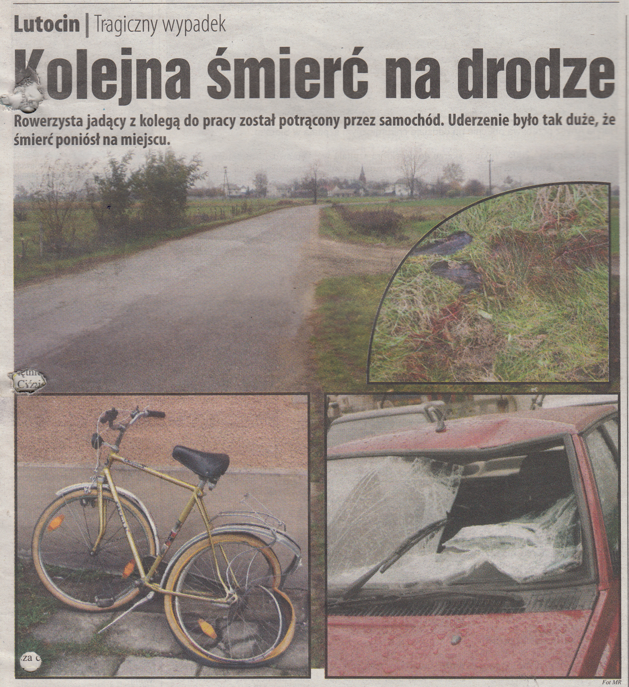 We wtorek 31 październka 2006 roku na drodze z Lutocina w kierunku Elżbiecina polonez potrącił rowerzystę. Rowerami jechali obok siebie dwaj koledzy, mieszkańcy Lutocina. Jednym z nich był 23 letni Stanisław B. Jechali do pracy przy łapaniu kur. Około 500 metrów za Lutocinem za łukiem drogi jest droga polna prowadząca do kurników. Stanisław B. jadąc bliżej środka jezdni, skręcał w drogę do kurnika. Nie widział jadącego za nim samochodu. Zdaniem kierowcy nie obejrzał się i nie dał sygnału reką, że chce skręcać. Wpadł prosto pod maskę poloneza, który akurat wyprzedzał rowerzystów. Uderzenie było bardzo silne. Rowerzysta przeleciał przez samochód, uderzył głową o krawędź dachu i upadł w pobliskim rowie. Śmierć poniósł na miejscu. Pomimo wezwania na miejsce karetki pogotowia młodego mężczyzny nie udało się uratować.