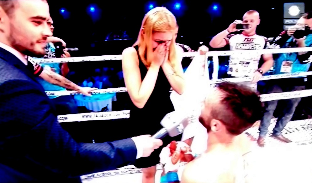 Kamil Łebkowski fighter z Żuromina rozbił Piotra Hallmanna podczas gali FEN w Gdyni. Po walce Kamil podziękował swojej ekipie, kibicom i dziewczynie. Zaprosił Patrycję na ring, klęknął i zapytał: Wyjdziesz za mnie?