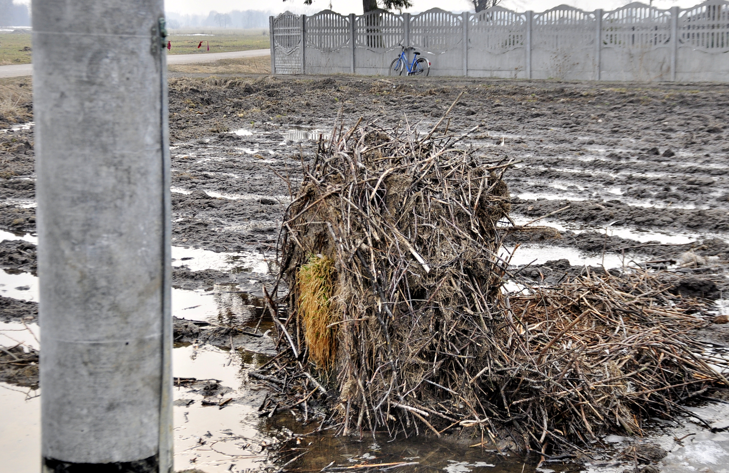 Bocian, jak obserwowali mieszkańcy Kobylej Łąki, od kilku dni krążył wokół gniazda. Próbował wić nowe gniazdo. Tymczasem stare, solidne lęgowisko leżało w błocie tuż obok słupa.