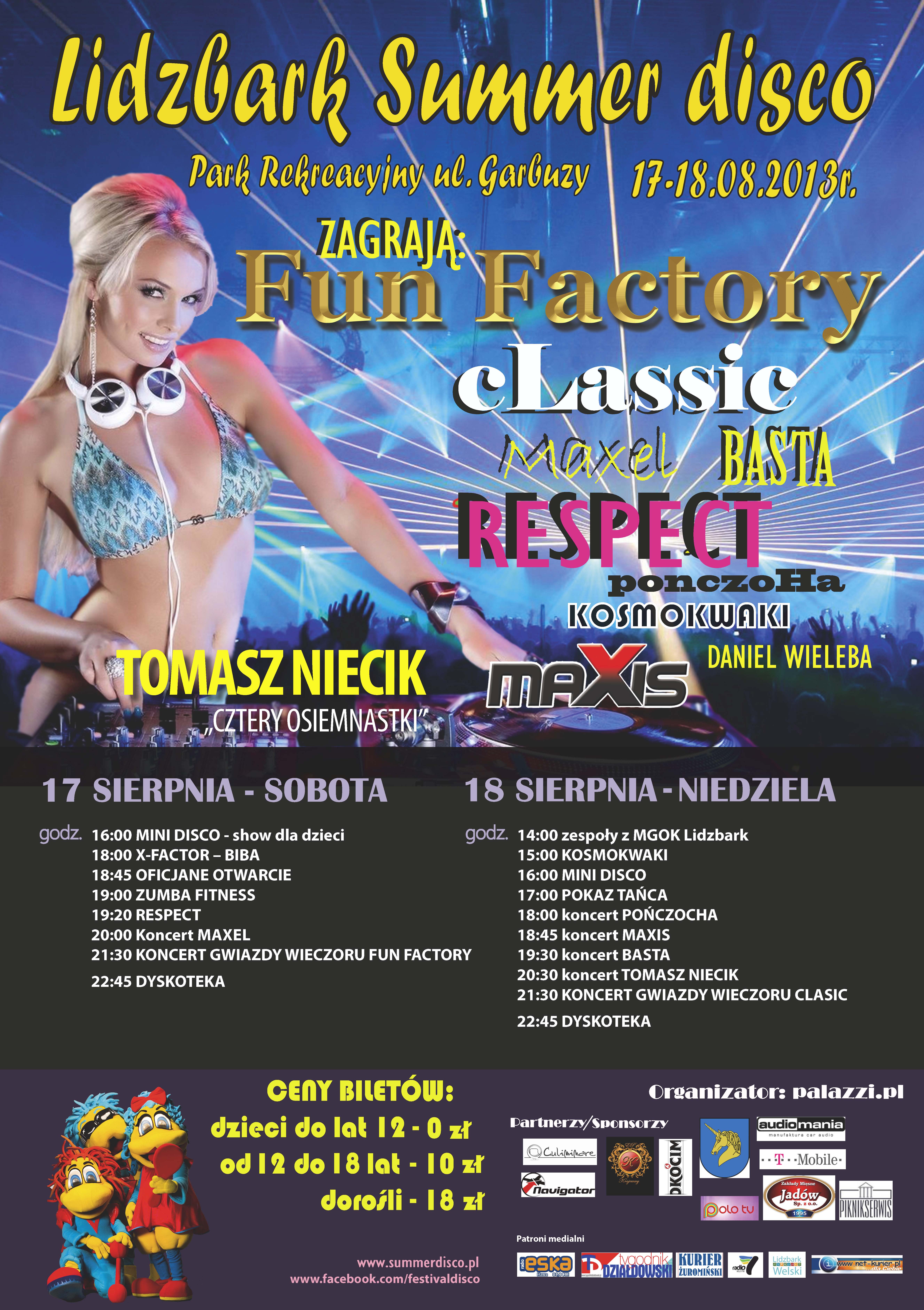 Lidzbark Summer Disco 2013, taką nazwę nosi impreza która odbędzie się w Lidzbarku 17 i 18 sierpnia. Program imprezy przewiduje atrakcję dla dzieci i dorosłych. W sobotę 17 sierpnia będzie można się bawić od godziny 15:00. najpierw odbędzie się mini disco show a następnie pokaz zumby fitness. Oficjalnie imprezę rozpocznie burmistrz o godzinie 18:00. Następnie będą się odbywać koncerty: zespołu „XFAKTOR” i zespołu „Maxel”. O godzinie 21:30 na scenie wystąpi gwiazda festiwalu, zespół Fun Factory. Po koncercie do późnych godzin nocnych przewidziana jest dyskoteka. W niedzielę od godziny 13:00 przygotowane będą atrakcje dla dzieci. Odbędzie się również pokaz tańca z gwiazdami. O godzinie 18:00 rozpoczną się koncerty. Na scenie wystąpią: zespół „ponczoHa”, „Respect”, „Basta” a o godzinie 21:00 zagra zespół „Classic” oraz Tomasz Niecik. Bilet na imprezę kosztuje 18 złotych, dzieci w wieku powyżej 12 lat płacą 10 złotych.