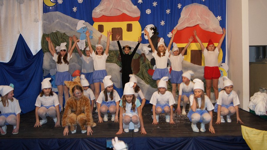 Zabawę choinkową rozpoczęto programem muzyczno-tanecznym pt. „Zimowe wspomnienia Smerfów”. W roli Gargamela wystąpił Artur Cywiński, w roli Klakiera – Iza Wronkowska, w roli Papy Smerfa – Dawid Kapela. Scenariusz i choreografię taneczną przygotowały Aleksandra Cywińska i Jolanta Brodzińska. Autorem scenografii była Mirela Kijora-Wieczorek. Dekorację wykonali: Małgorzata Ławicka, Iza Kapela i Marek Domżalski. W programie wystąpiło 46 uczniów klas I – V szkoły podstawowej uczęszczających na kółka taneczne prowadzone przez Aleksandrę Cywińską dla klas IV – VI i Jolantę Brodzińską dla klas I – III. Przygotowania do występu trwały dwa miesiące, gdyż dzieciaki musiały opanować wiele układów choreograficznych.