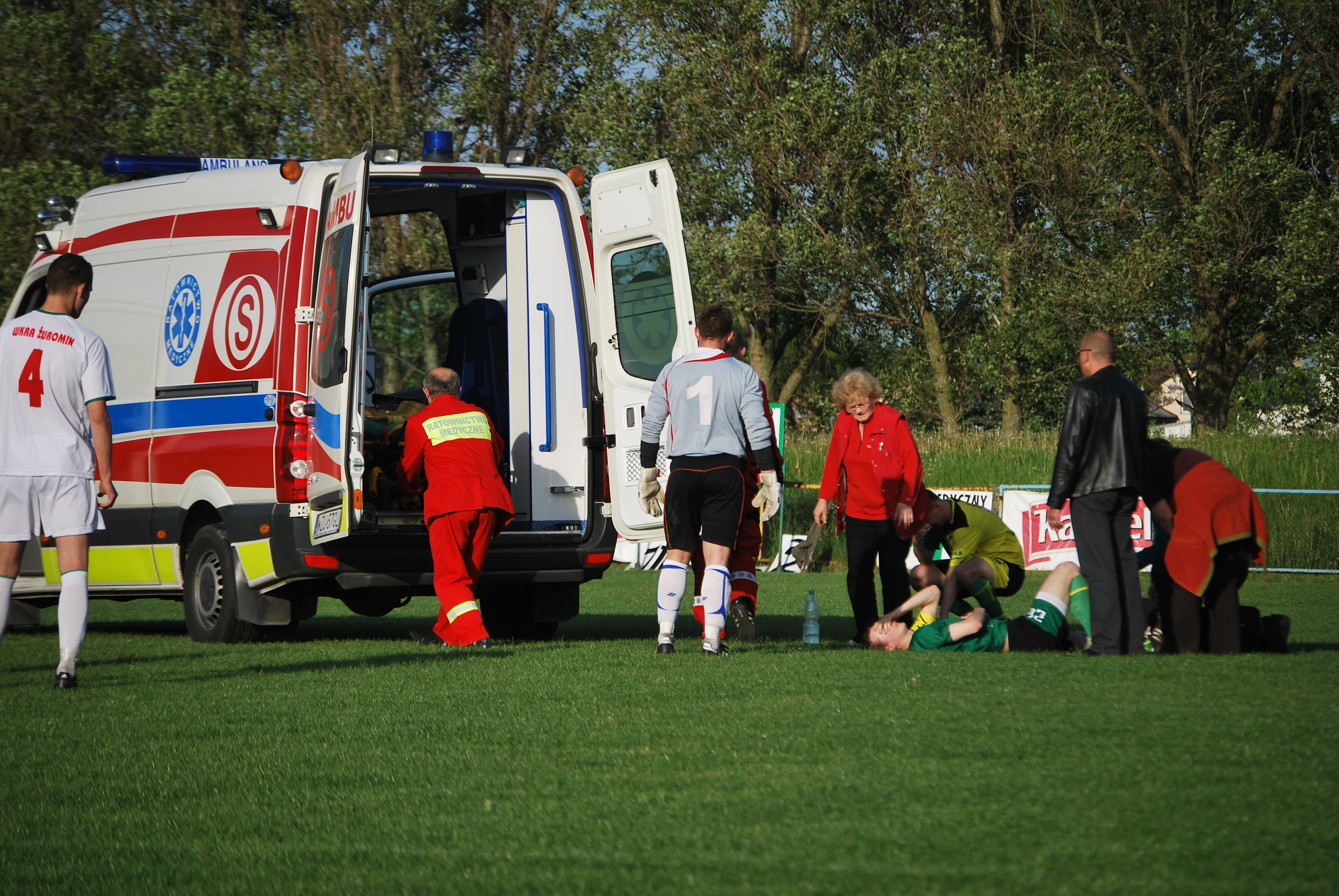 Cieniem na boiskowe wydarzenia kładzie się sytuacja z 77 minuty. Wstrząsnęła ona wszystkimi zgromadzonymi na obiekcie. Kibice, piłkarze, sztab szkoleniowy na pewno długo będą mieli tę sytuację w pamięci. Podlasie wychodzi z kontratakiem. Zawodnik gości ciągnięty jest za koszulkę, a sędzia nie przerywa gry. Piłkę próbuje wybić Piotr Pikalski, ale trafia w nogę rywala. Gra toczy się dalej, a zawodnik leży na murawie. Płacze i zwija się z bólu. Sędzia przerywa grę, karze Pikalskiego czerwoną kartką i nakazuje wezwanie karetki. Okazało się, że piłkarz doznał otwartego złamania lewej nogi. Na twarzach innych piłkarzy pojawiło się przerażenie i niedowierzanie. – W takich chwilach odechciewa się grać w piłkę – mówi jeden z żuromińskich piłkarzy. To był straszy widok. Jeden z graczy Podlasia płakał na boisku, inni odchodzili i nie chcieli w ogóle na to patrzeć – dodaje. Po przyjeździe karetki pogotowia piłkarza zabrano do szpitala, a kibice w momencie wkładania noszy do ambulansu nagrodzili zawodnika gromkimi brawami. Cała ta sytuacja trwała ponad kwadrans.
