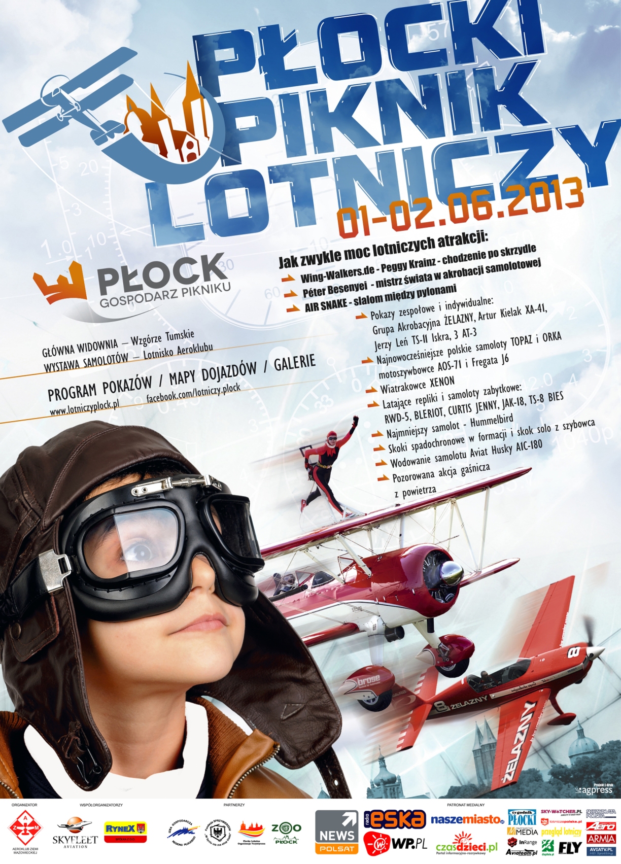 W pierwszy weekend czerwca do Płocka ponownie zawitają całymi rodzinami amatorzy lotnictwa z całej Polski, by spędzić Dzień Dziecka w niepowtarzalnej atmosferze. Nad Płockiem znowu będzie można usłyszeć warkot silników, a ze Wzgórza Tumskiego zobaczyć niesamowite akrobacje i przeloty samolotów. W tym roku wśród największych atrakcji znajdą się, m.in. pokazy akrobatyczne jednego z najlepszych pilotów na świecie – Petera Besenyei’a, Mistrza Świata w akrobacji samolotowej i zwycięzcę prestiżowych zawodów Red Bull Air Race, oraz po raz pierwszy w Polsce „chodzącą po skrzydle” Peggy Kreinz. Największym wyróżnikiem Pikniku Lotniczego w Płocku wśród innych tego typu imprez w Polsce, poza niepowtarzalną lokalizacją i możliwością oglądania samolotów z wysokiego na 50 m Wzgórza Tumskiego, jest widowiskowo niska akrobacja w wykonaniu mistrzów pilotażu, czyli AIR SNAKE. Jest to niezwykłe połączenie slalomu i wyścigu pomiędzy 5 pylonami rozstawionymi w powierzchni Wisły. Nie zabraknie również kultowej już w Polsce Grupa Akrobacyjna „Żelazny” ze swoimi niepowtarzalnymi powietrznymi ewolucjami oraz zespołu „Polskie Legendy Lotnictwa” w składzie Artur Kielak na XA-41 i Jerzy Leń na TS-11 Iskra, którzy stworzą dla widzów niezapomniane i pełne emocji trójwymiarowe widowisko na niebie. Wielkiej frajdy widzom powinien dostarczyć pokazowy zrzut bomby wodnej na Wisłę w pozorowanej akcji gaśniczej przez PZL M18 Dromader i lądowanie na Wiśle wodnosamolotu Aviat Husky. Na niebie pojawią się również latające repliki samolotów historycznych, szybowce, spadochroniarze, najmniejszy samolot świata Hummel Bird oraz wiatrakowce Xenon. Wszystkie statki powietrzne będzie można podziwiać również na wystawie statycznej na lotnisku Aeroklubu. To nie wszystkie atrakcje, jakie przygotował Płock na pierwszy weekend czerwca. Z okazji Dnia Dziecka w płockim ZOO odbędzie się impreza rodzinna, na której nie zabraknie zabaw z animatorami, konkursów, gier oraz innych atrakcji. W tym dniu wstęp do ZOO będzie bezpłatny. Na wszystkich odwiedzających ogród zoologicznych czeka ponad 3000 zwierząt w 300 gatunkach (w tym wiele okazów cennych i rzadko spotykanych w innych ogrodach), park linowy ZOOLANDIA oraz zjazd tyrolski. Więcej na www.zoo.plock.pl Pokazy i przeloty samolotów podczas Pikniku Lotniczego najlepiej oglądać z malowniczej skarpy, która jest nie tylko pięknym tarasem widokowym na rozlewającą się po horyzont szeroką wstęgę Wisły, ale także świadkiem kulturowego i historycznego bogactwa miasta. Na Wzgórzu Tumskim powstała katedra i zamek. Tu miał swą siedzibę Władysław Herman i Bolesław Krzywousty, a Płock był wówczas stolicą Polski. Obowiązkowym punktem zwiedzania Płocka jest m.in. Muzeum Mazowieckie, które słynie w kraju i za granicą z najbogatszej w Polsce kolekcji sztuki secesyjnej i art déco. Więcej informacji o Płocku na stronie Płockiej Lokalnej Organizacji Turystycznej www.turystykaplock.eu