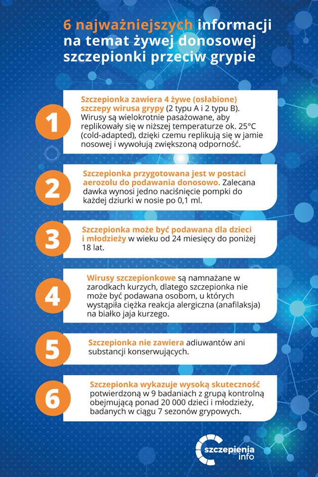 Żywej donosowej szczepionki przeciw grypie nie wolno stosować u dzieci z osłabionym układem odpornościowym, w tym zaburzeniami krwi, objawowym zakażeniem wirusem HIV, nowotworami, jak również u dzieci leczonych salicylanami.