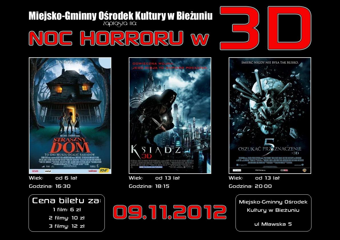 9 listopada w Miejsko – Gminnym Ośrodku Kultury w Bieżuniu będzie można obejrzeć 3 filmy w jakości 3D: „Straszny dom” o godzinie 16:30, „Ksiądz” godzina 18;15 i „Oszukać przeznaczenie 5” o godzinie 20:00.