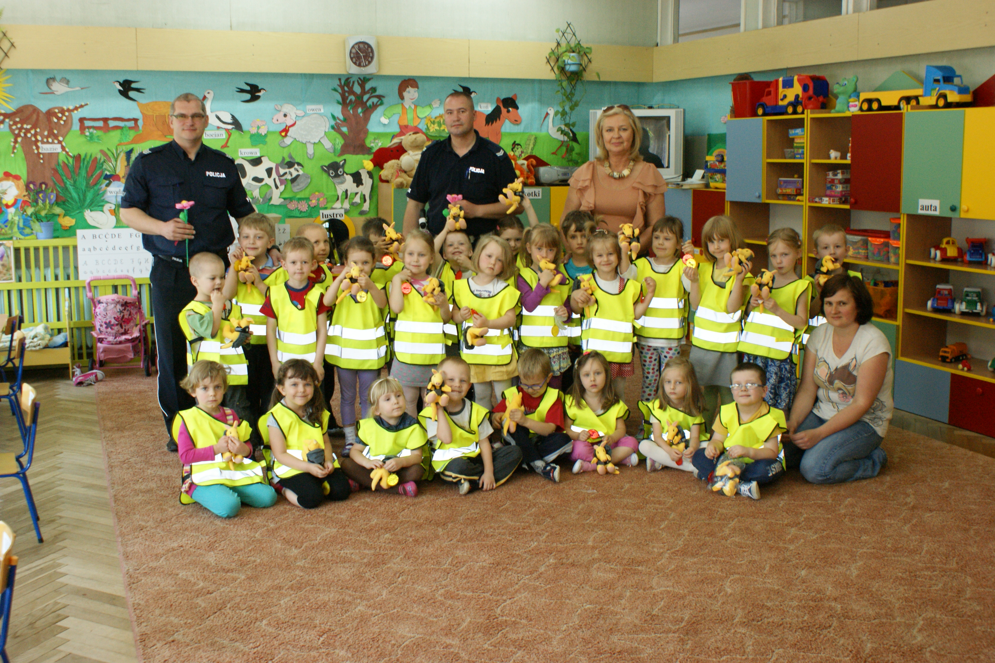 Funkcjonariusze zademonstrowali maluchom jakie wyposażenie ma policjant na służbie oraz opowiedzieli jakie są jego obowiązki. Oczywiście nie zabrakło pogadanki na temat bezpieczeństwa w poruszaniu się na drodze. Policjanci na zakończenie rozdali dzieciom maskotki (pluszoe pancerniki) oraz kamizelki odblaskowe i inne gadżety pomagające być widocznym na drodze.