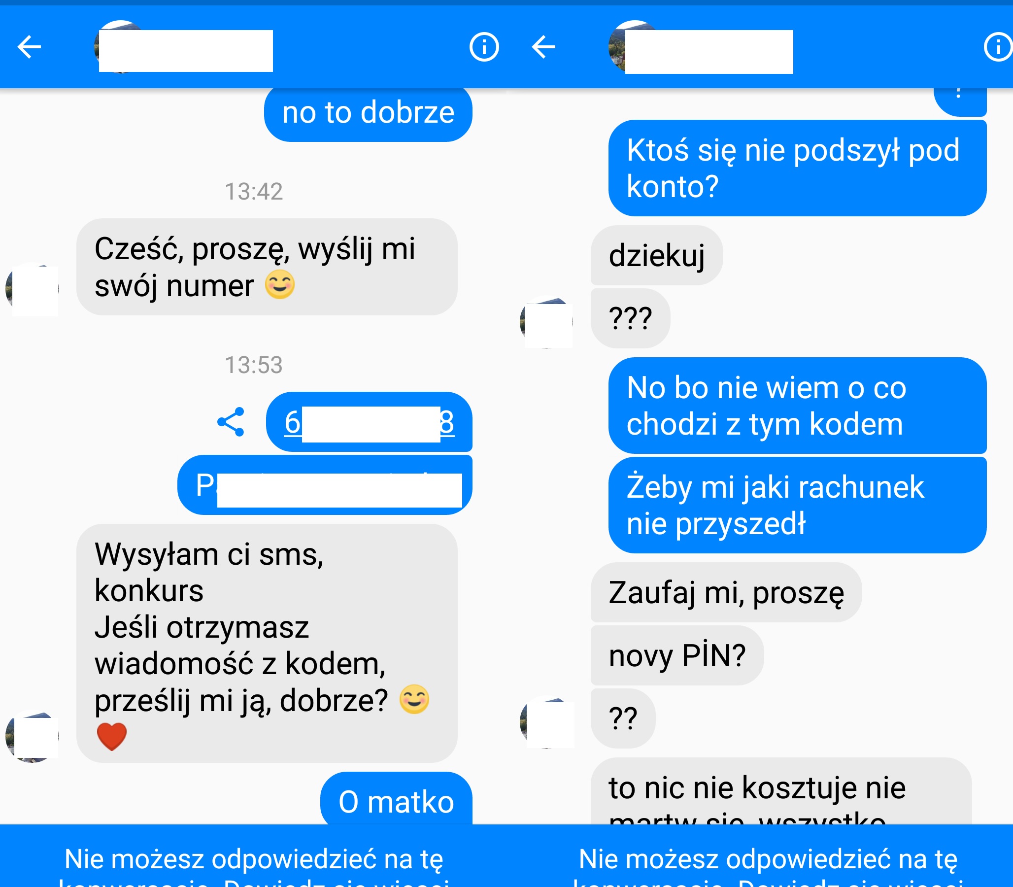 Jak pisaliśmy, do całego zajścia doszło na początku listopada. Jak ustalili śledczy, ktoś włamał się na konto jednego z dyrektorów szkoły na terenie powiatu i za pomocą komunikatora messenger wprowadził w błąd szereg osób. Doszło do wyłudzenia numerów telefonów i kodów do płatnej usługi. Pokrzywdzeni wysyłali swój numer telefonu, po czym dostawali sms z kodami. Wtedy oszust od razu prosił o ich przesłanie, tłumacząc się, że bierze udział w konkursie, a wiadomość nic nie kosztuje. W rezultacie rachunki pokrzywdzonych były obciążane różnymi kwotami.