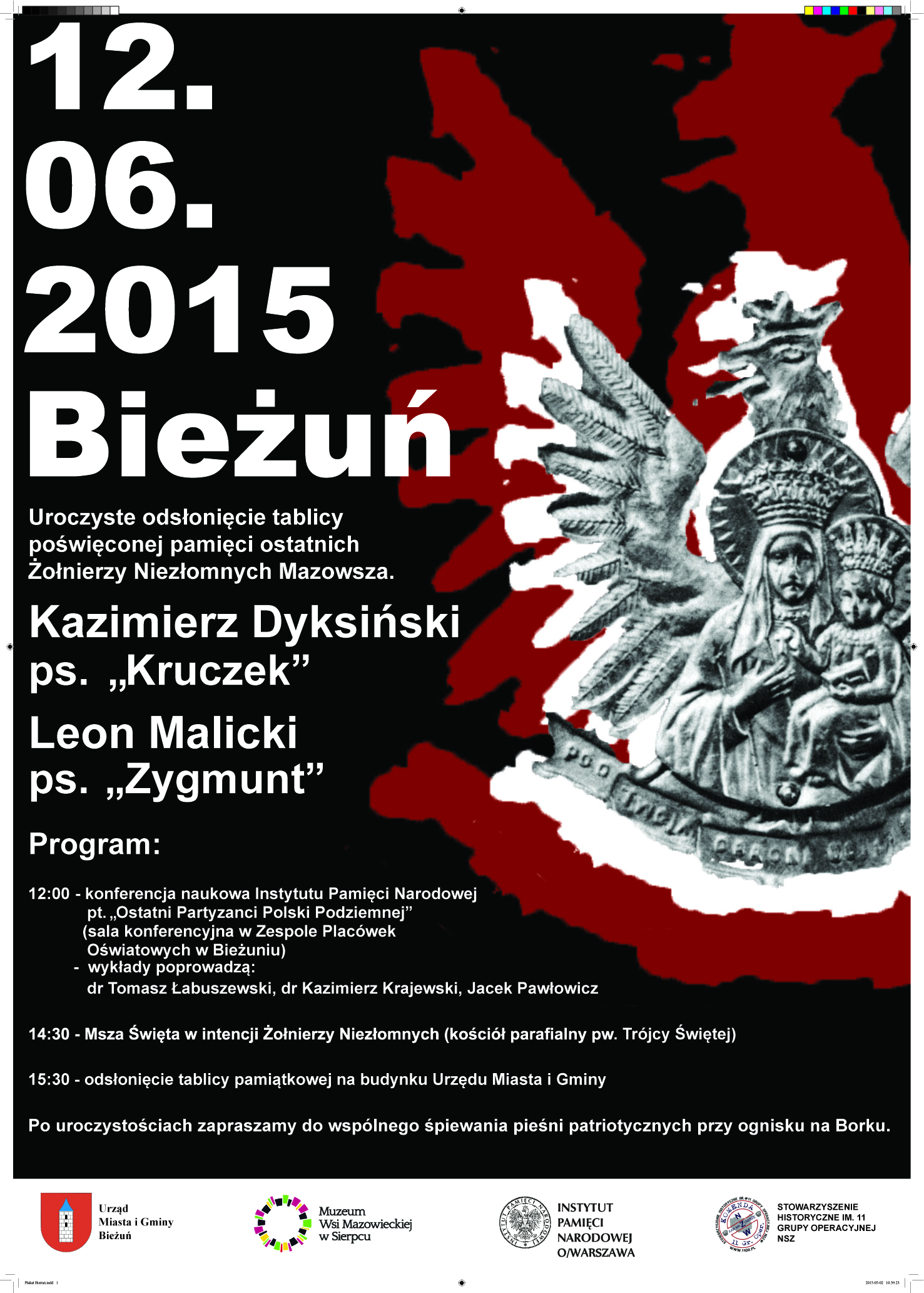 Tablica ma swoje miejsce na budynku Urzędu Miasta w Bieżuniu. Uroczystości rozpoczną się o godzinie 12:00 w Zespole Placówek Oświatowych konferencją naukową Instytutu Pamięci Narodowej pt.: “Ostatni Partyzanci Polski Podziemnej”. O 14:30 odbędzie się Msza Święta w kościele parafialnym w intencji Żołnierzy Niezłomnych. Po mszy nastąpi uroczyste odsłonięcie pamiątkowej tablicy. Uroczystości zakończą się wspólnym śpiewem pieśni patriotycznych przy ognisku na Borku.