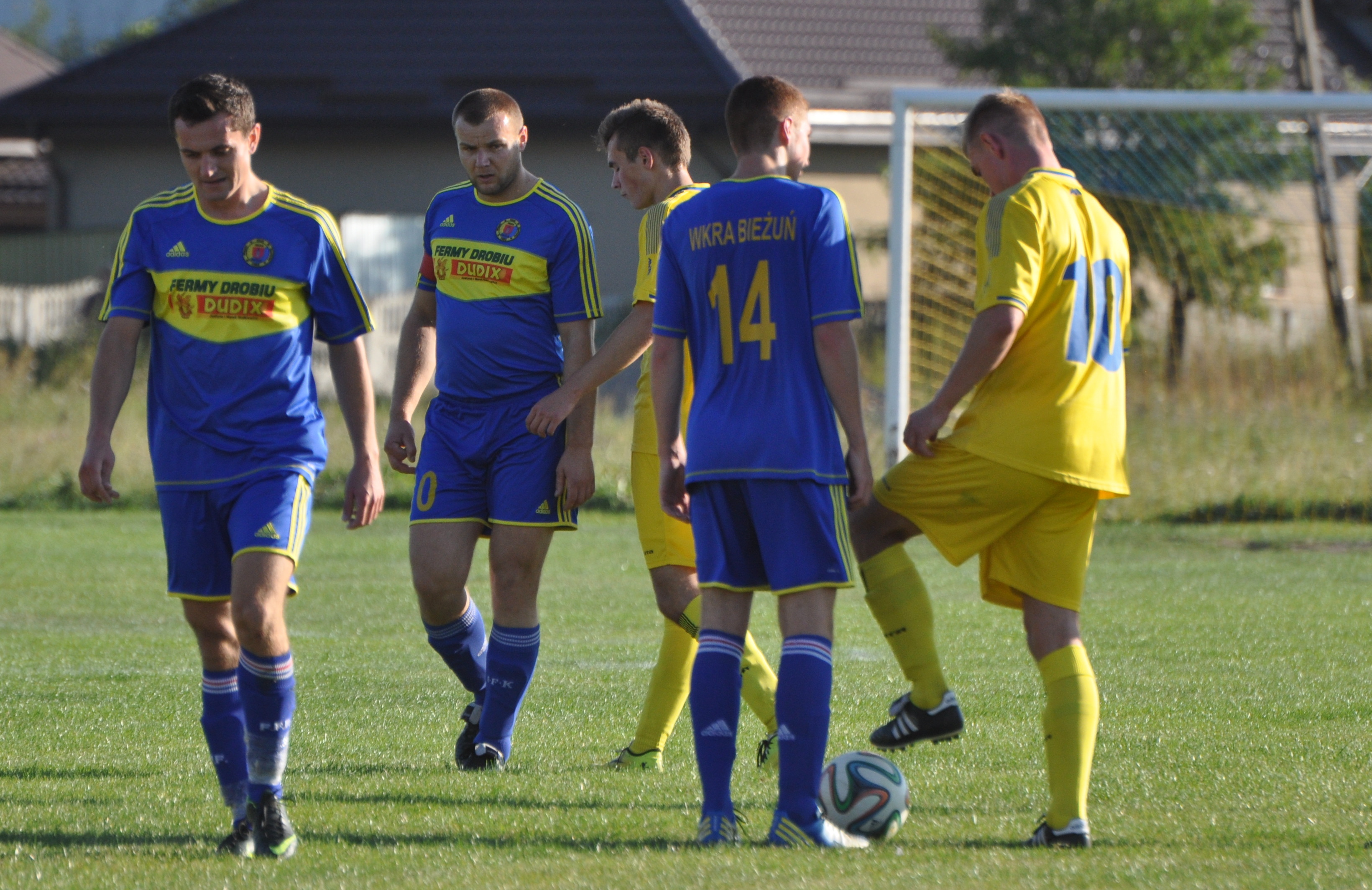 Od początku spotkania była to bardzo spokojna gra obu zespołów. Piłkarze z Bieżunia z minuty na minutę przeważali. Grali długą piłką i w prosty sposób chcieli przenieść się pod bramkę Tęczy. Gospodarze cofnęli się na własną połowę boiska i czekali na kontrataki. W 16 minucie po prostopadłym zagraniu Przemysława Wiśniewskiego do Dariusza Petrykowskiego ten ostatni wyszedł sam na sam, a bramkarz faulem przerwał akcję bieżunian. Sędzia nie wahał się. Rzut karny. Do piłki podszedł Paweł Baca i pewnym strzałem zdobył pierwszego gola. Zespół z Bieżunia po zdobyciu bramki dalej miał grę pod kontrolą i nic nie wskazywało na to, że „Tęczowi” jeszcze przed przerwą zdobędą wyrównanie. Źle ustawiona linia defensywna, prostopadłe zagranie do Rafała Traczyka i napastnik Tęczy wyszedł sam na sam i bez najmniejszych problemów zdobył bramkę, która dała remis.