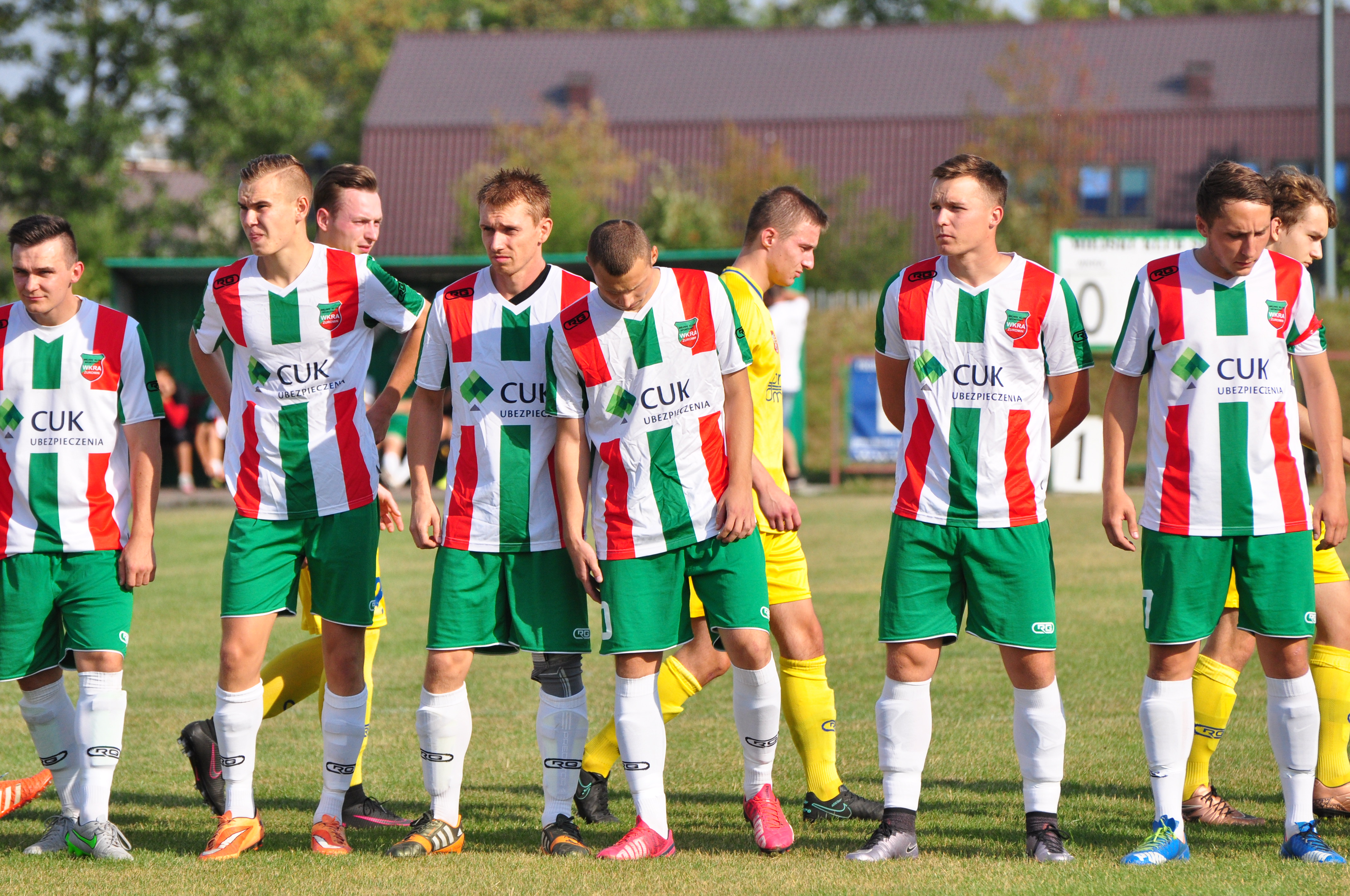 Wkra Żuromin po ubiegłotygodniowej porażce chciała w Krasnem zdobyć komplet punktów. Żurominianie do spotkania ponownie przystąpili bez Dominika Stopczyńskiego, ale poza tym trener Błaszkiewicz miał do swojej dyspozycji wszystkich graczy. Wkra od pierwszych minut próbowała konstruować akcje krótkimi podaniami i w ten sposób przenieść ciężar gry pod bramkę rywala. Gospodarze prostymi środkami. Długie zagranie do napastników, bądź przerwanie akcji i skuteczna kontra. W 35 minucie to gospodarze wykorzystali jedną ze swoich akcji. Prostopadłe podanie od Patryka Tosika do Daniela Malinowskiego, a ten wyszedł sam na sam. Napastnik gospodarzy nie strzelał, ale dograł piłkę partnerowi. Adam Niestępski nie miał problemów ze zdobyciem gola. Do przerwy ani żurominianie nie potrafili odpowiedzieć rywalom, ani miejscowi nie stworzyli okazji, by móc podwyższyć prowadzenie.