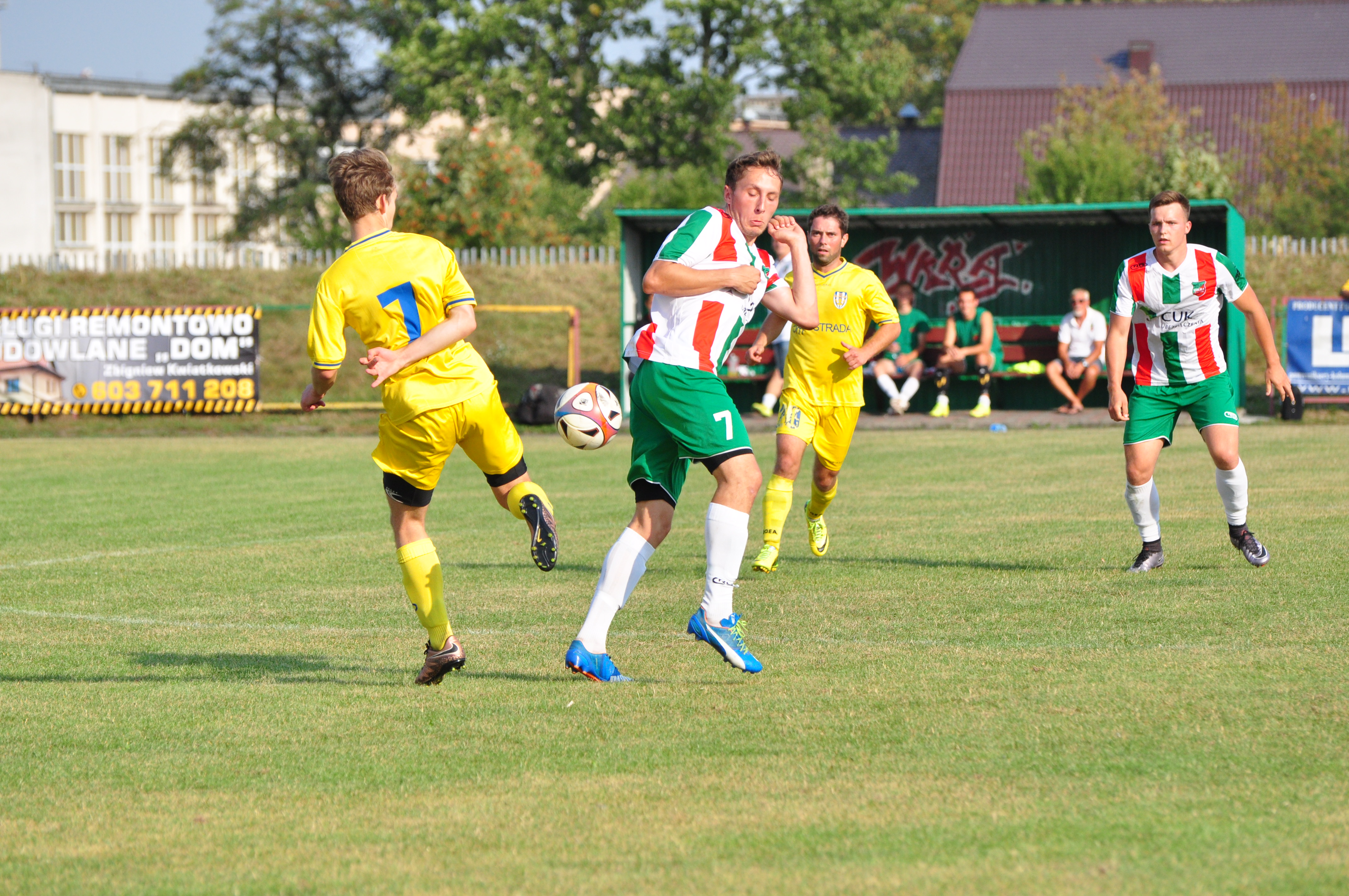 W siódmej minucie spotkania Wkra wyszła na prowadzenie. Arbiter główny tego meczu Cezary Dzięgielewski podyktował rzut wolny dwadzieścia pięć metrów przede bramką gości za zagranie ręką. Do piłki ustawionej centralnie przed bramką podszedł Tomasz Kamiński. Środkowy pomocnik żuromińskiej Wkry przymierzył idealnie. Piłka przeleciała nad murem i wpadła w samo okienko bramki strzeżonej przez Sebastiana Szczechowiaka. Golkiper był bez szans.