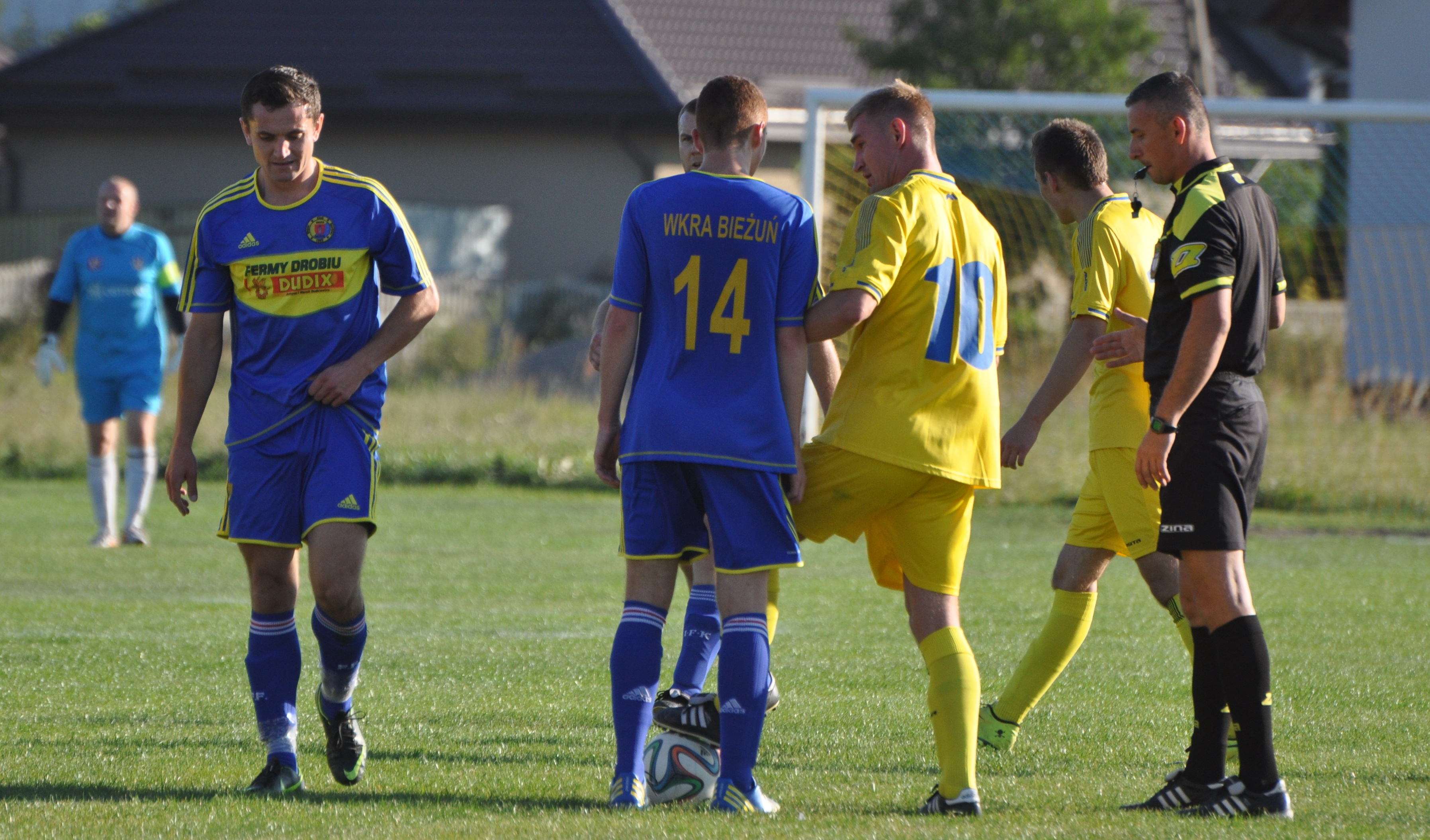 Najpierw gracze Piotrowskiego rywalizowali na boisku ze sztuczną nawierzchnią w Ciechanowie z zespołem Błękitnych Raciąż. Rywal z wyższej półki skutecznie obnażył słabe strony bieżunian. Po półgodzinie gry aspirujący do III ligi zespół prowadził z Wkrą 2:0. Później szkoleniowiec Błękitnych wymienił prawie całą jedenastkę. Ostatecznie bieżunianie nie dali rady zespołowi z Raciąża i przegrali 0:7.