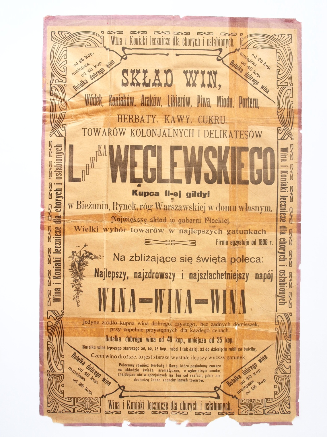 W czasach nam bliższych, a mianowicie z początkiem XX wieku, spotykamy się z zupełnie nową formą dystrybucji napojów alkoholowych, jaką była ich sprzedaż w specjalne do tego celu przeznaczonych składach. Jeden z nich, największy w guberni Płockiej mieścił się w Bieżuniu, na rogu Rynku i ulicy Warszawskiej ( obecnie siedziba Urzędu Miasta i Gminy). Należał do kupca II-ej gildyi Ludwika Węglewskiego. Oferował oprócz różnych gatunków wina w cenie od 25 kopiejek do 10 rubli za butelkę, szeroki wybór wódek, koniaków, araków, likierów, piwa, miodu i porteru. Szczególnie polecane były wina i koniaki lecznicze dla chorych i osłabionych!