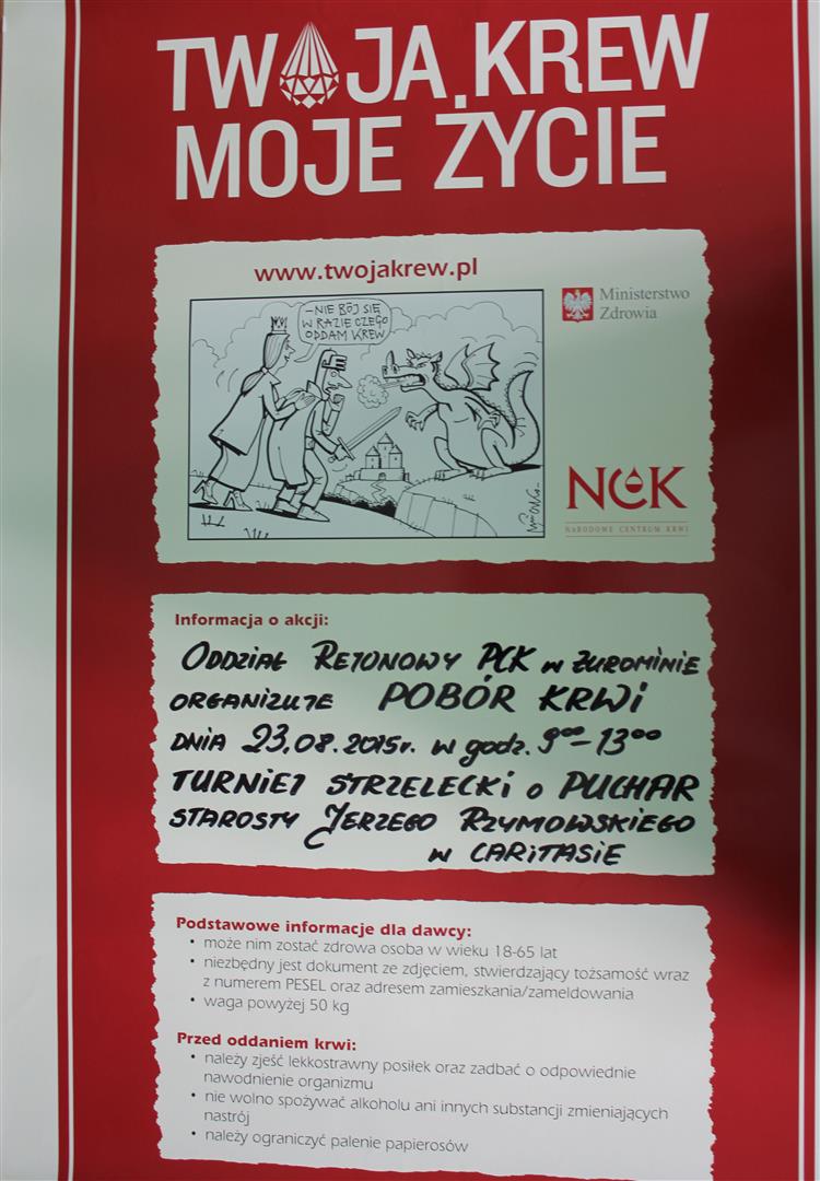 Pierwszy pobór w tym roku odbędzie się 24 stycznia. Tradycyjnie krew będzie można oddać przy żuromińskim Caritasie. Kolejne pobory zaplanowano na: 3 kwietnia, 5 czerwca, 7 sierpnia, 9 października i 11 grudnia. Dwa pobory odbędą się specjalnie dla uczniów. Jeden 24 lutego a drugi 11 listopada. W tych terminach uczniowie będą mogli oddać krew przy Zespole Szkół Ponadgimnazjalnych w Żurominie.