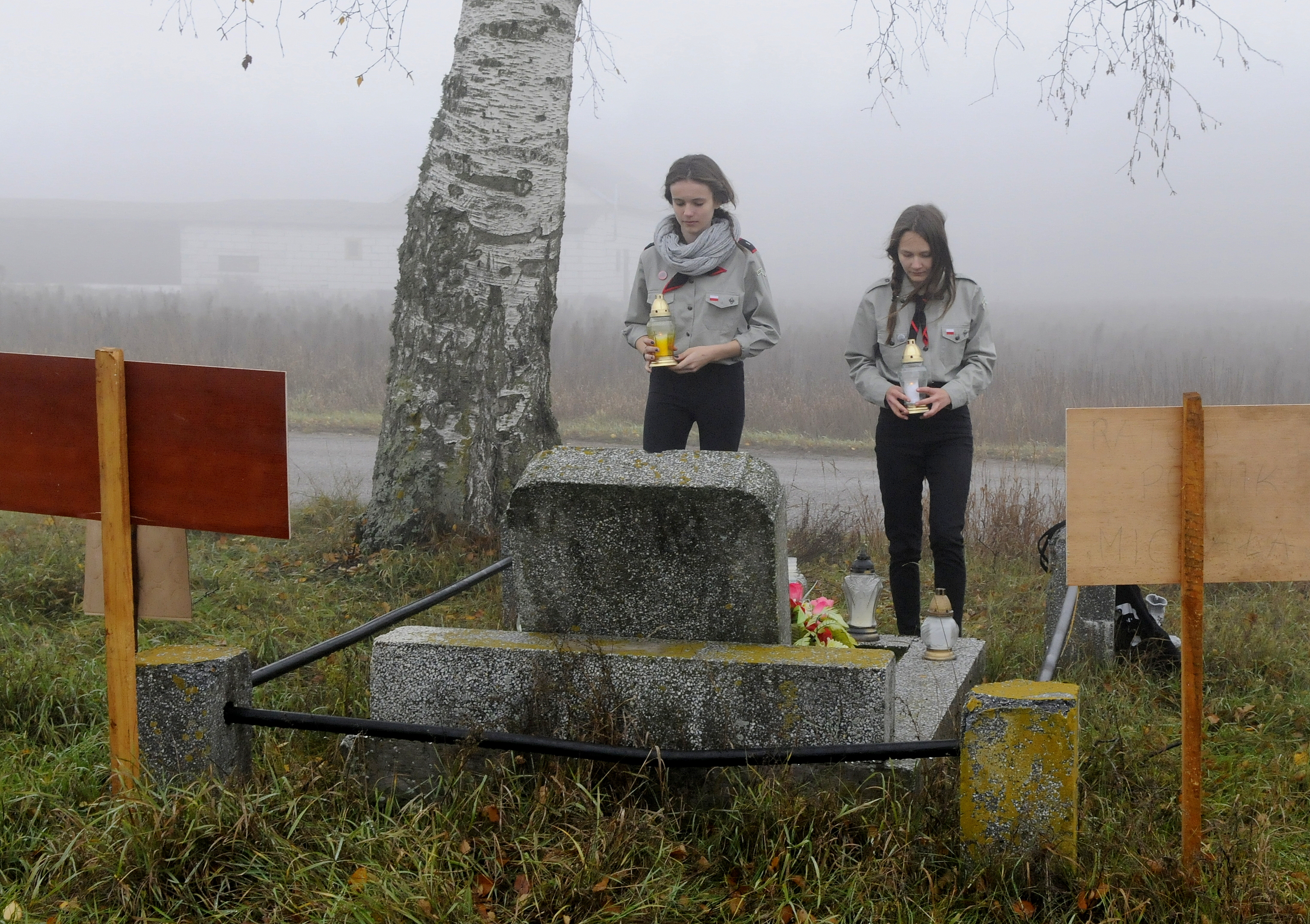 - Coś się dzieje przy pomniku w Pątkach. Jedźcie tam szybko – takie słowa usłyszeliśmy w słuchawce telefonu we wtorek 3 listopada o godzinie 10:00. Pojechaliśmy. Na miejscu nikogo nie było, za to ktoś wokół mogiły wbił drewniane płyty z odręcznie nieortograficznie namalowanymi napisami: „Ratój pomnik Michała!”