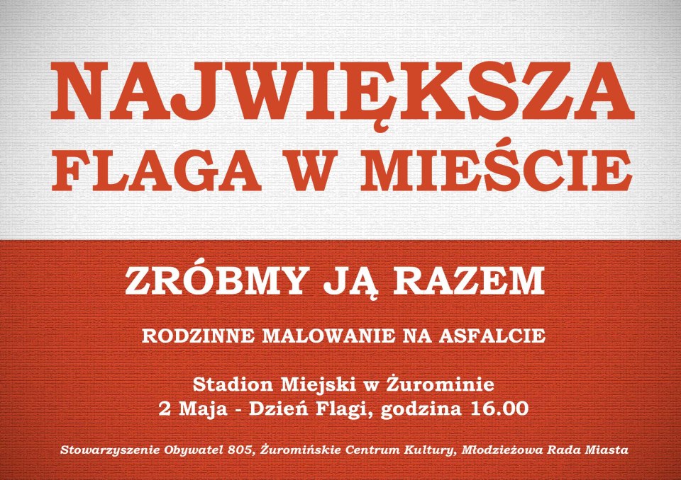 Chętni do wzięcia udziału w rodzinnym malowaniu, będa flagę Polski malować kredą na asfalcie przy Stadionie Miejskim w Żurominie 2 maja. Początek godzina 16:00.