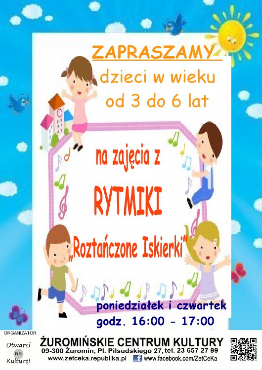 W Żuromińskim centrum Kultury w poniedziałki i czwartki w godzinach 16;00 - 17:00 odbywają się zajęcia dla dzieci z rytmiki.