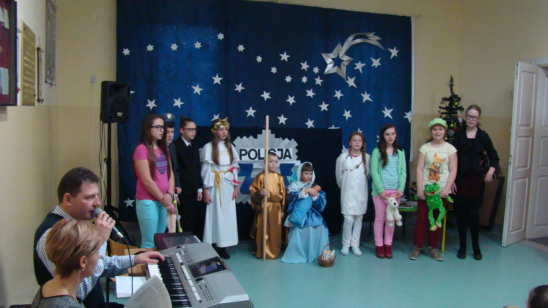 Piękny, odnowiony pałac tętniący obecnie szkolnym gwarem i świąteczny wystrój – choinka przybrana w bombki i kolorowe lampki. Nie brak też oczywiście nieodłącznego atrybutu Bożego Narodzenia czyli stajenki, w której siedzą Józef i Maryja z dzieciątkiem na ręku. Po krótkim przywitaniu przez księdza Sebastiana Krupniewskiego grona nauczycielskiego, uczniów i przybyłych gości rozbrzmiewa kolęda rozpoczynająca jasełka. Przewijają się anioł i diabełki, policjant grany przez dwunastoletniego Bartka Czerwińskiego, któremu trudno jest ustalić personalia anioła i wójt obiecujący wraz z radnymi i sołtysami złożyć dary w Betlejem. Lekarz gnający „erką” do stajenki i nauczyciel „ budżetowiec” darowujący dla dzieciątka na ciepły kocyk sto złotych, a poszczególne sceny przeplatane są kolędami podchwytywanymi przez widzów.
