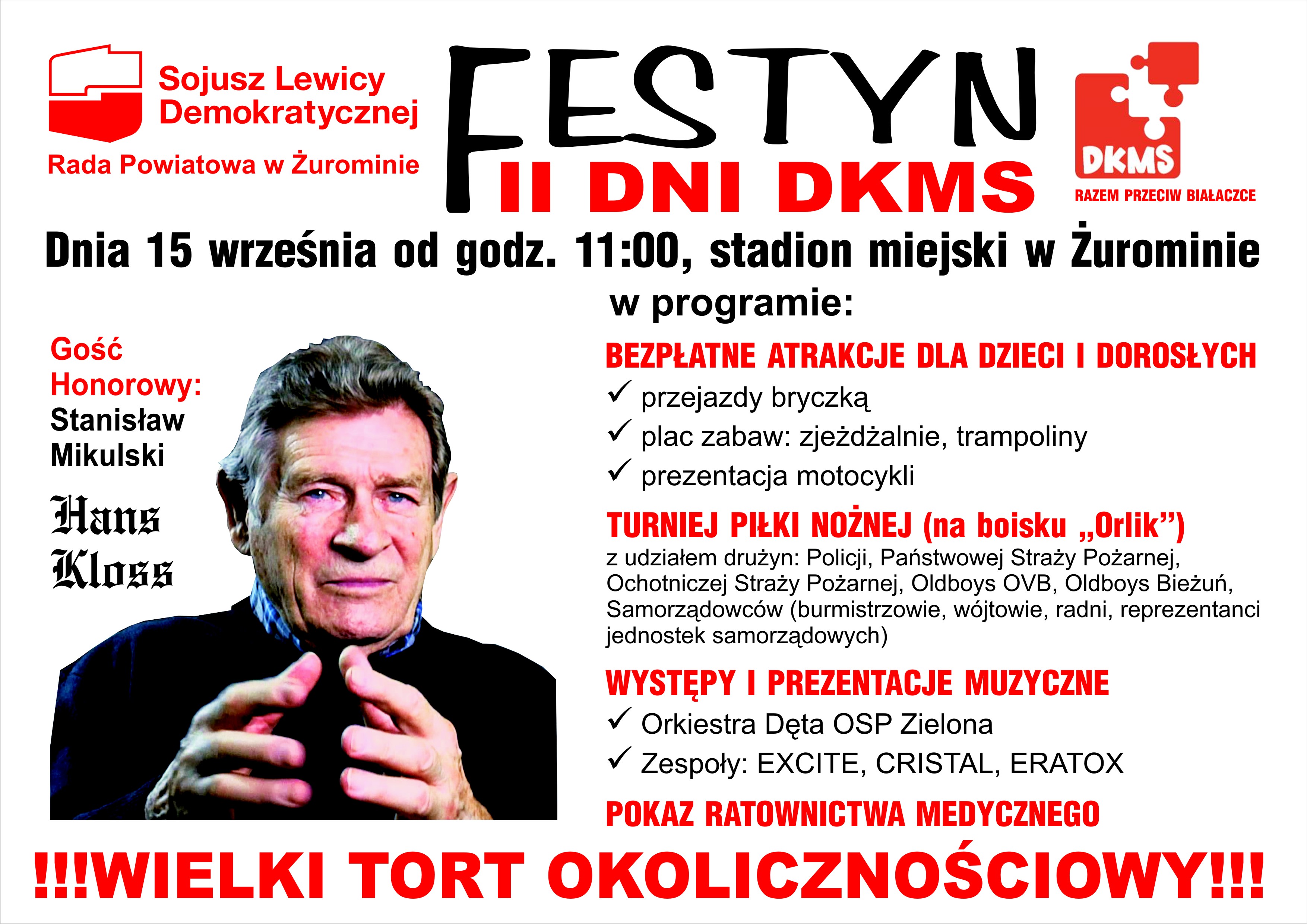 Dzień Dawców Komórek Macierzystych w Żurominie jest organizowany po raz drugi. W tym roku 15 września będziecie państwo mogli zadeklarować chęć pomocy innym. Wystarczy oddać do badania wymaz ze śliny. Osoba, która podpisze deklaracje oddania komórek macierzystych znajdzie się w bazie danych stowarzyszenia DKMS. Być może w przyszłości ta osoba będzie miała możliwość uratowania komuś życia. Potwierdzono już oficjalnie informację o obecności gościa specjalnego, aktora Stanisława Mikulskiego znanego z serialu „Stawka większa niż życie”. Organizatorzy zaplanowali również wiele atrakcji dla dzieci i dorosłych na żuromińskim „orliku” m.in. bezpłatna przejażdżka bryczką, plac zabaw dla dzieci, pokaz ratownictwa medycznego, turniej piłki nożnej (do turnieju zgłosiło się już 10 drużyn). Do turnieju zgłaszają się cały czas również drużyny ochotniczych straży pożarnych. W koszulkach z logo stowarzyszenia DKMS zagrają razem w meczu piłki nożnej Samorządowcy. To może być ciekawe doświadczenie. Jeżeli pogoda będzie deszczowa impreza zostanie przeniesiona do hali sportowej przy LO w Żurominie.