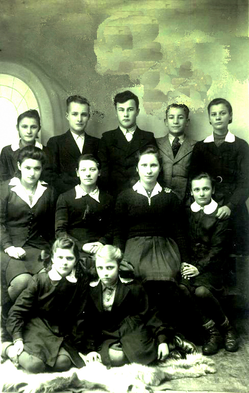 Bohaterowie tajnych komplet�w: W g�rnym rz�dzie od lewej: Wies�awa D�browska, Tadeusz Rutowski, Eugeniusz Zag�rny, Leszek Krajewski, Halina Kawczy�ska. W �rodkowym rz�dzie od lewej: Emilia Byber, nauczycielka Helena Pop�awska – nauczycielka, Maria S�owiko