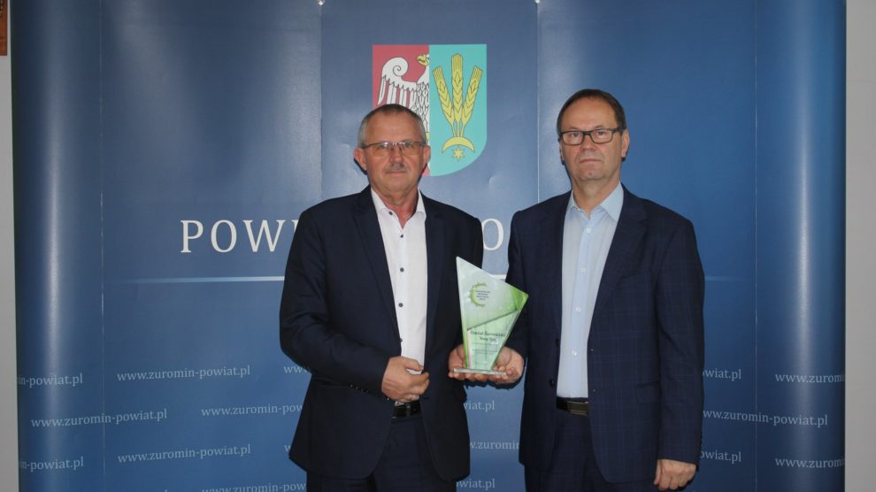 Starosta Jerzy Rzymowski oraz wicestarosta Ireneusz Rejmus odebrali statuetkę w imieniu całego samorządu powiatu za realizację programu szczepień.