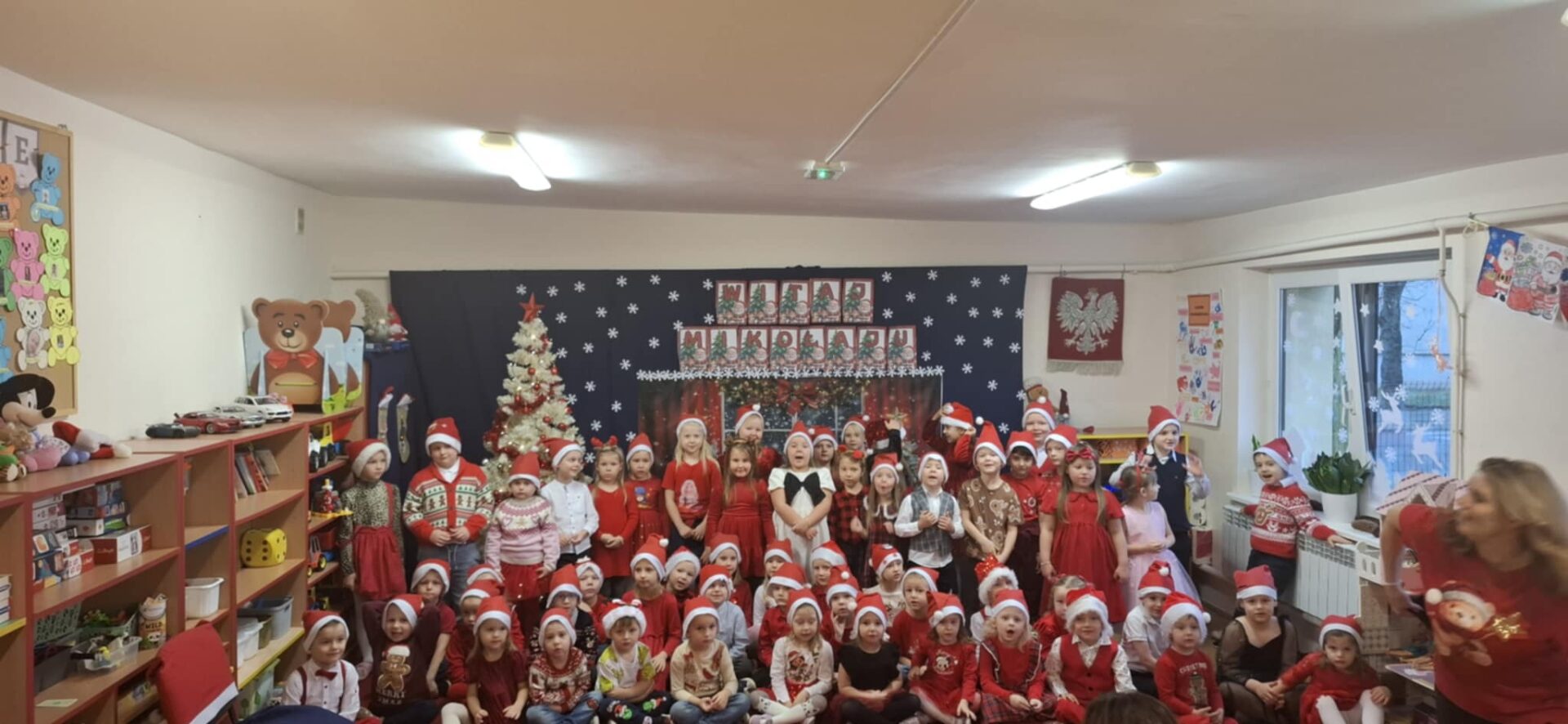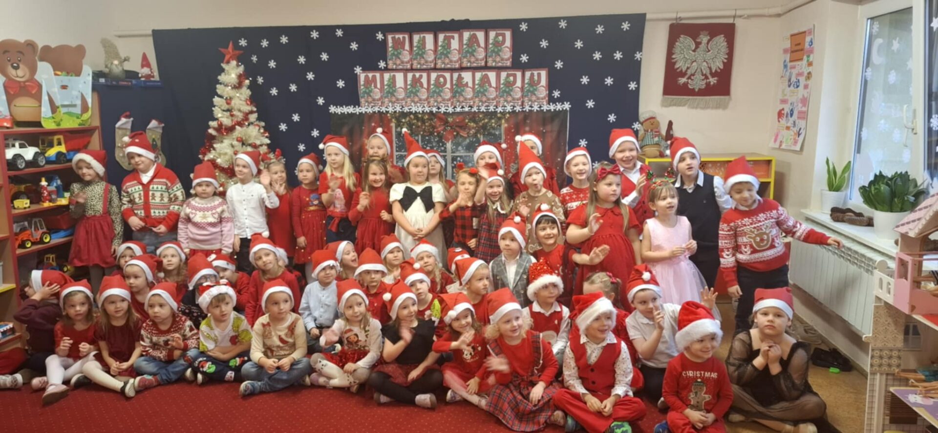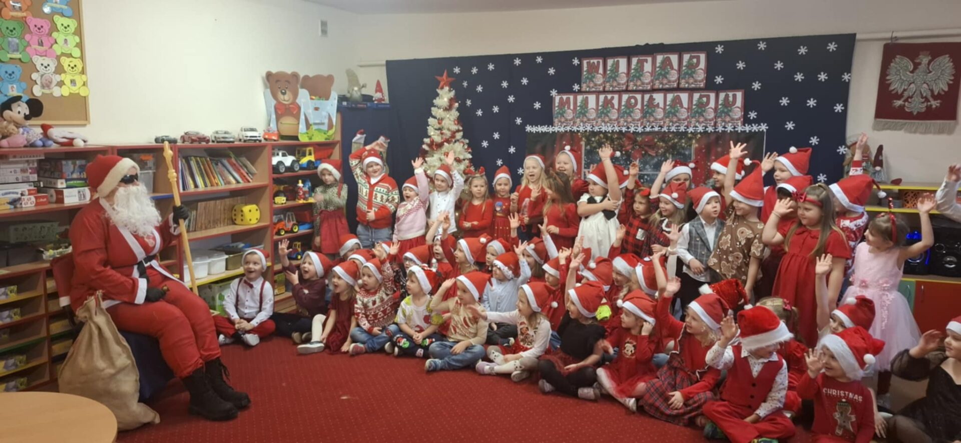 W grupie przedszkolnej wybuchła wielka euforia i towarzyszyła dzieciom podczas powitania Mikołaja. Gość przywiózł dzieciom prezenty a przedszkolaki prezentowały mu swoje zdolności.