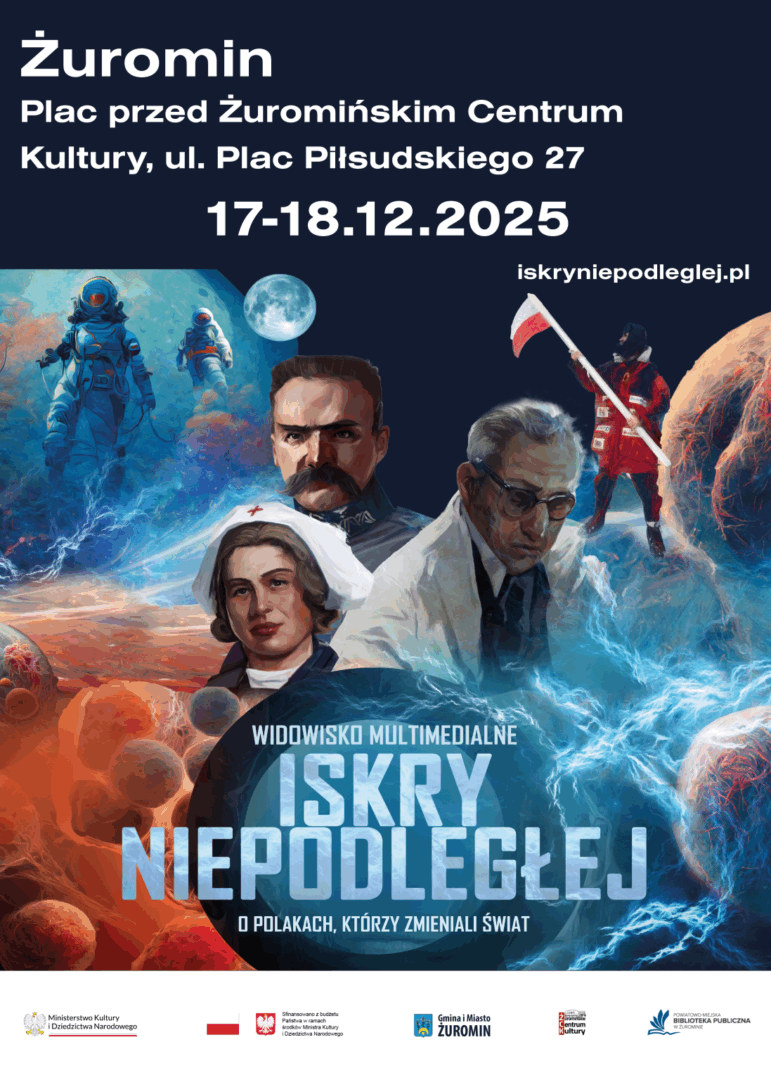 17 i 18 grudnia, z inicjatywy Powiatowo-Miejskiej Biblioteki Publicznej w Żurominie, przyjedzie do Żuromina niezwykłe widowisko. „Iskry Niepodległej” to nowoczesne, multimedialne widowisko przygotowane przez Instytut Adama Mickiewicza — a jego celem jest pokazanie wybitnych Polek i Polaków, którzy w ostatnim stuleciu swoją pracą, odkryciami i odwagą zmienili świat.