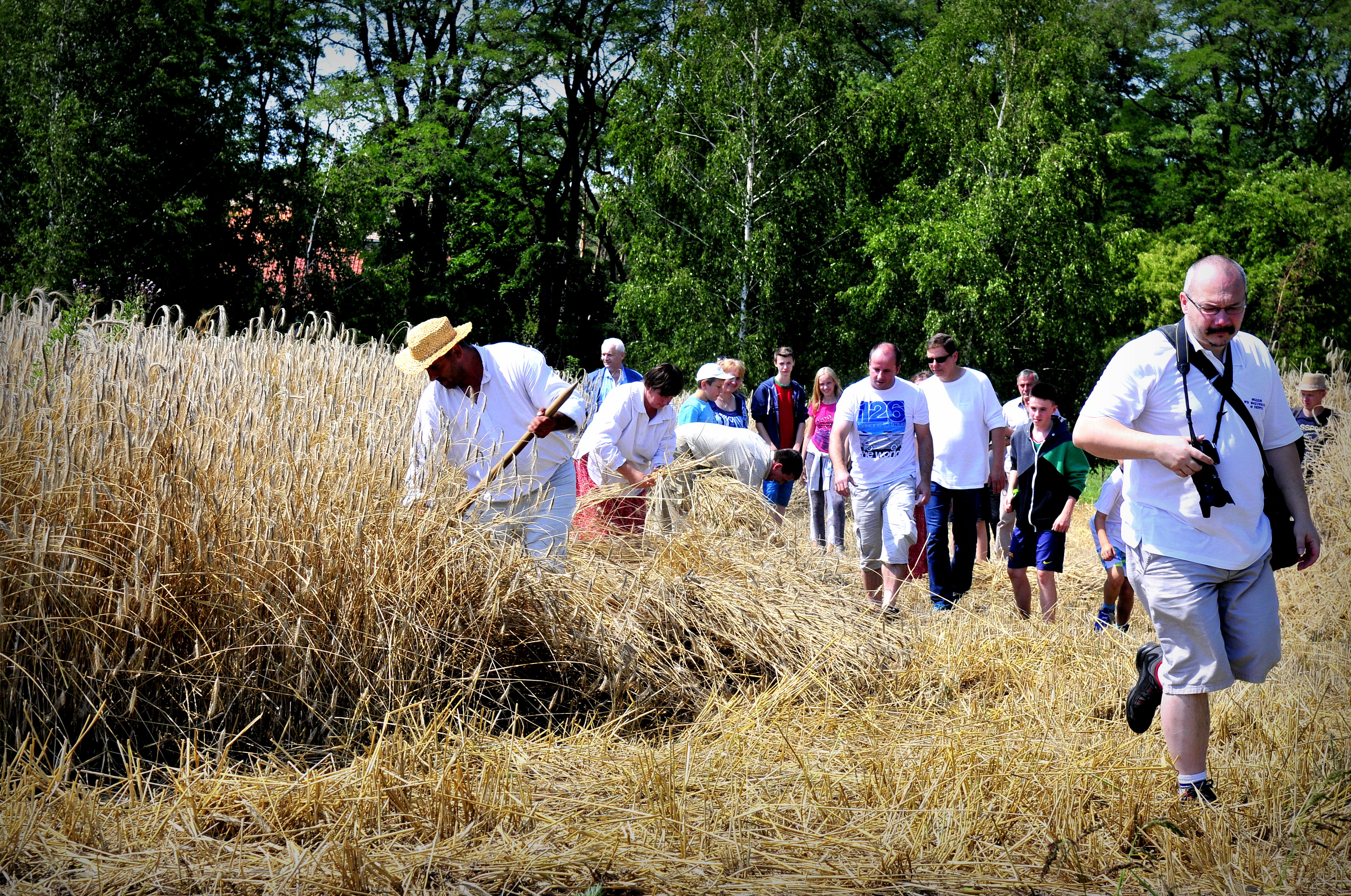 Organizatorzy „Żniw…” zadbali o każdy szczegół. Chłopi ubrani są tak jak dawniej, korzystają z oryginalnych narzędzi, począwszy od sierpa i kosy, przez młockarnie, cepy, żarna… Na pola przeniosło się życie całej wsi. Pracują wszyscy. Najtrudniejsze prace wykonują mężczyźni, kobiety pomagają przy wiązaniu snopków, przygotowują posiłki, dzieci też się nie nudzą, służąc pomocą starszym. W pracach polowych mogli wziąć udział także zwiedzający. Można się było przymierzyć do kosy, popracować przy zbieraniu siana. W jednej ze stodół obsługa uczyła posługiwania się cepem i żarnami do mielenia zboża.