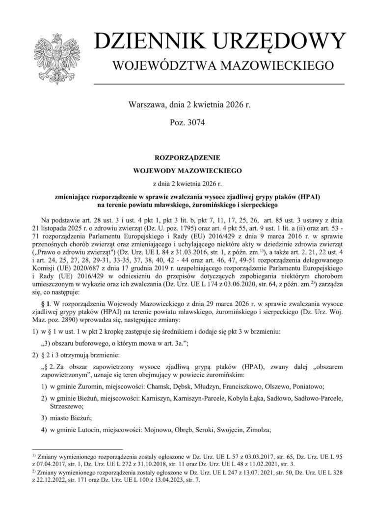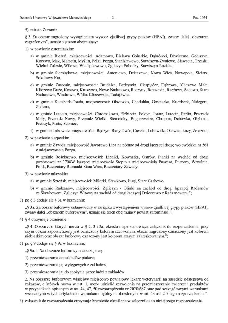 W powiatach żuromińskim, sierpeckim i mławskim wyznaczone zostały strefy zapowietrzone i zagrożone, w których obowiązują szczegółowe regulacje dotyczące utrzymania ptaków oraz przemieszczania produktów pochodzenia ptasiego.