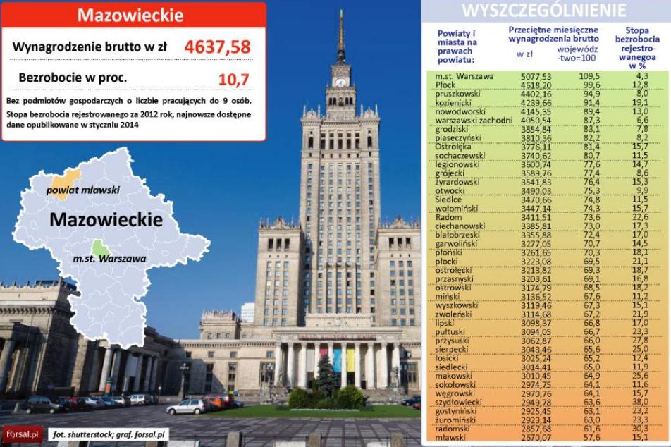 Wysokość średniego wynagrodzenia w rozróżnieniu na powiaty opublikował portal forsal.pl. Województwo mazowieckie jest najbogatsze w Polsce. Średnie wynagrodzenie jego mieszkańców wynosi 4 637,58 zł. Wysokość wynagrodzenia w zależności od powiatu w województwie mazowieckim różni się o 2 407,46 zł. Najwięcej zarabiają mieszkańcy Warszawy, średnio 5 077,53 złote brutto. W Warszawie jest również najniższe bezrobocie, które wynosi 4,3%. na drugim miejscu jest miasto Płock. Tam pracownicy otrzymują średnio 4 618,20 zł. Powiat żuromiński znajduje się pod koniec tej listy. Według portalu zarabiamy średnio 2 923 zł brutto. A jak to wygląda u naszych sąsiadów? W powiecie sierpeckim średnie wynagrodzenie wynosi 3 043,46 zł, w powiecie płońskim 3 261,65 zł. Mniej niż w powiecie żuromińskim zarabia się w powiecie mławskim. Tam średnie wynagrodzenie wynosi 2 670,07 zł. Powiat ten znalazł się na samym końcu listy z średnimi wynagrodzeniami.