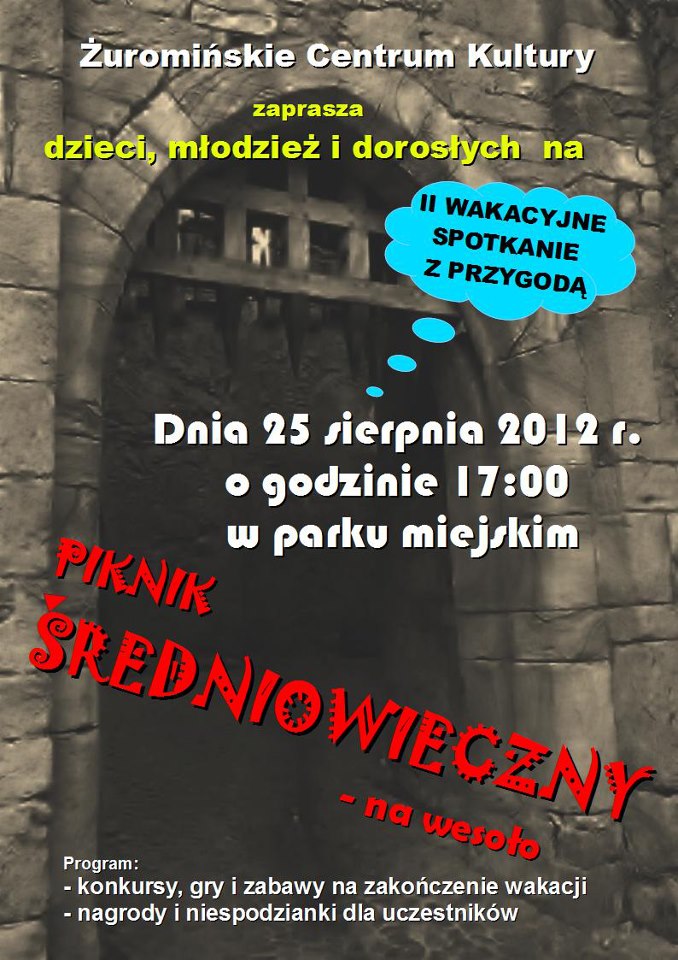 Od godziny 17:00 dzieci, młodzież i dorośli będą mogli uczestniczyć w pikniku średniowiecznym. W programie przewidziane są gry i zabawy. Nagrody i niespodzianki dla uczestników. Organizatorem imprezy jest Żuromińskie Centrum Kultury.