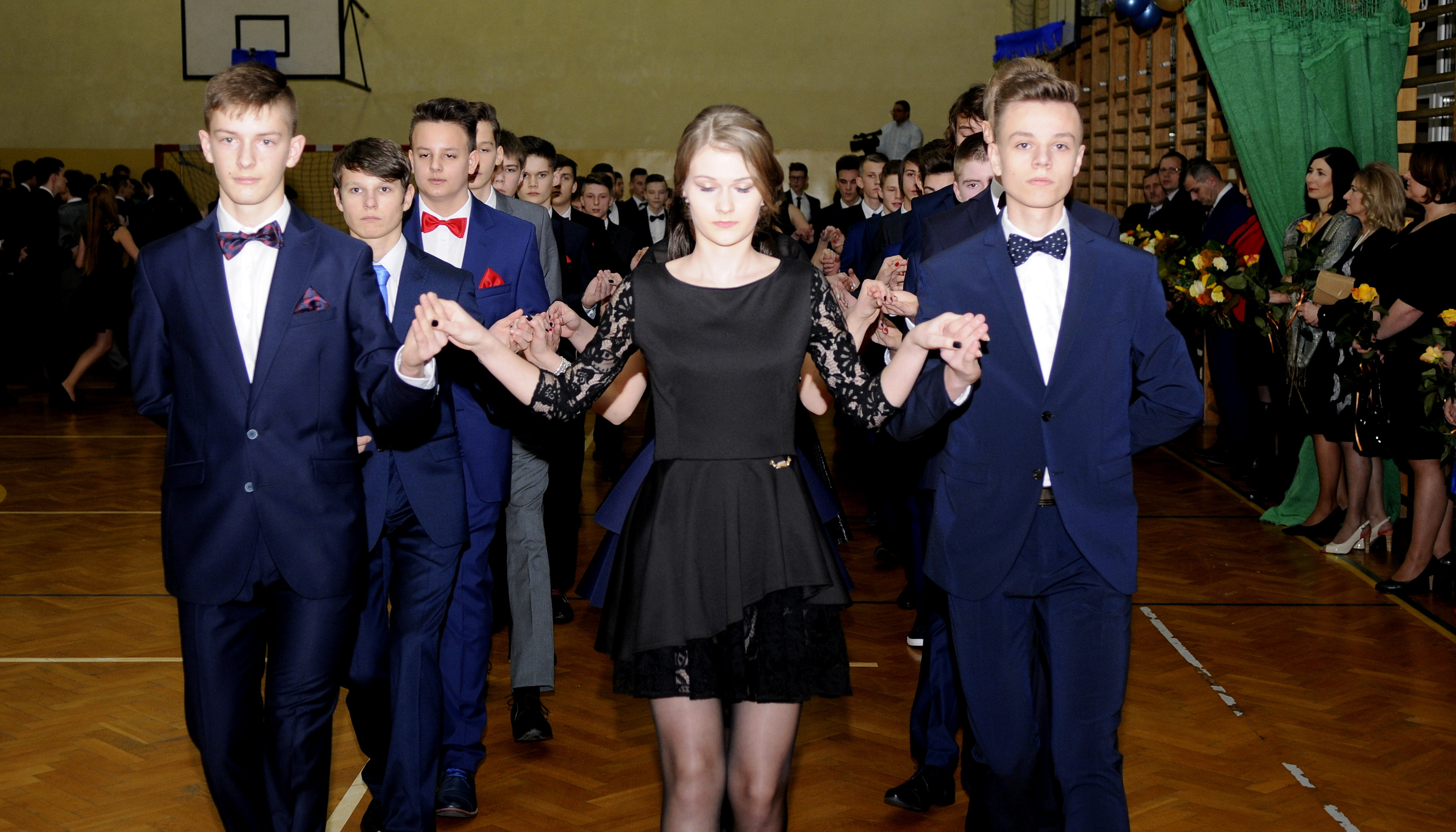 Po podziękowaniach uczniowie zatańczyli pięknego poloneza w nietypowym układzie. Tym razem na jedną tancerkę przypadało dwóch partnerów.