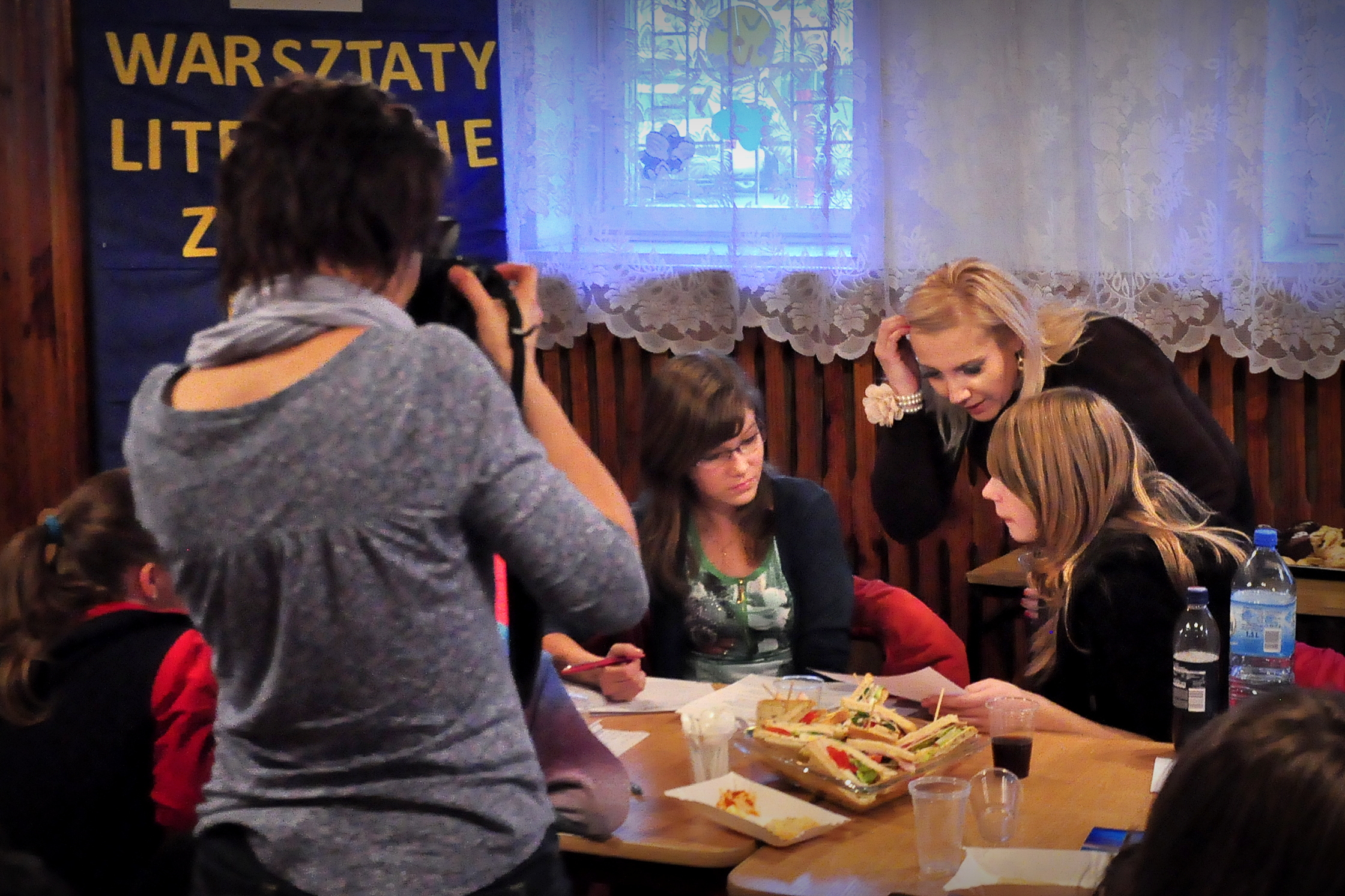 Podczas warsztat�w literackich Monika Sawicka instruuje adept�w sztuki pisarskiej