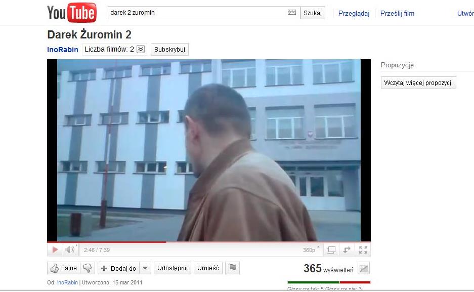 Najpierw stoją przy przedszkolu nr 2. Potem wchodzą na teren Liceum. Następnie idą w kierunku Zespołu Szkół Ponadgimnazjalnych. Kilku młodych mężczyzn, których udało nam się zidentyfikować jako uczniów tej ostatniej szkoły, w czasie tego spaceru nagrywa najprawdopodobniej telefonem komórkowym film. Głównym bohaterem filmu jest mieszkający w Żurominie Darek. Osoba upośledzona intelektualnie. Uczniowie zadają Darkowi pytania, skąd ma swój zegarek, czy przeszukiwał już śmietniki przy liceum, co sądzi o policji. Każdą odpowiedź kwitują salwami śmiechu. Darek nie zdaje sobie sprawy, że jest nagrywany. Prawdopodobnie nie wie nawet, że istnieje coś takiego jak kamera.