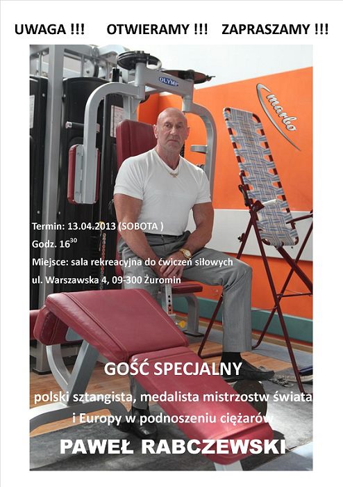 Siłownia była tam już wcześniej, ale została wyremontowana i wygląda zupełnie inaczej. Są lustra, dzięki którym pomieszczenie wydaje się większe, i nowy wysokiej jakości sprzęt. Uroczyste otwarcie rozpocznie się o godzinie 16:30. Będzie jej towarzyszyć wystawa zdjęć przedstawiających wygląd siłowni kiedyś i obecnie. Będzie też gość specjalny. Sztangista, medalista mistrzostw świata i Europy w podnoszeniu ciężarów Paweł Rabczewski (tak, tak ojciec TEJ Rabczewskiej).