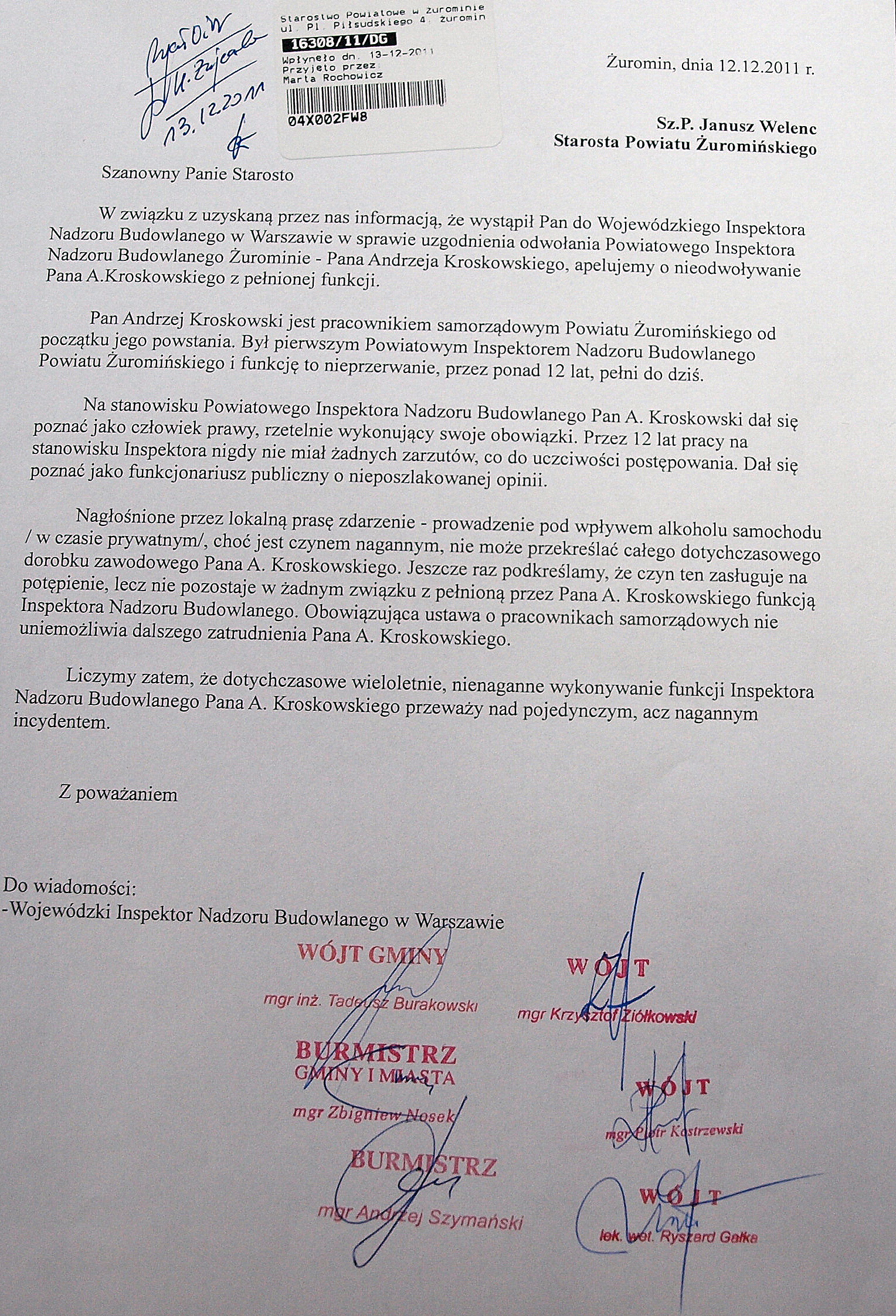 Do Starosty Żuromińskiego wpłynęło pismo z prośbą o nieodwoływanie z funkcji Inspektora Nadzoru Budowlanego w Żurominie Andrzeja Kroskowskiego. Dokument został podpisany przez: Wójta Gminy Kuczbork Tadeusza Burakowskiego, Burmistrza Gminy i Miasta Żuromin Zbigniewa Noska, Burmistrza Miasta I Gminy Bieżuń Andrzeja Szymańskiego, Wójta Gminy Lubowidz Krzysztofa Ziółkowskiego, Wójta Gminy Siemiątkowo Piotra Kostrzewskiego, Wójta Gminy Lutocin Ryszarda Gałkę. Włodarze piszą, że Kroskowski „dał się poznać jako człowiek prawy, rzetelnie wykonujący swoje obowiązki. Przez 12 lat swojej pracy na stanowisku Inspektora nigdy nie miał rządnych zarzutów, co do uczciwości postępowania”. Zdaniem autorów pisma, prowadzenie pod wpływem alkoholu samochodu, za co Inspektor został już skazany prawomocnym wyrokiem, nie może przekreślać całego dotychczasowego dorobku zawodowego. Liczą, że „dotychczasowe wieloletnie, nienaganne wykonywanie funkcji Inspektora Nadzoru Budowlanego przeważy nad pojedynczym , acz nagannym incydentem”.