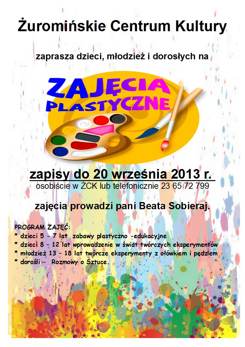 W ofercie przygotowanej w tym roku przez Żuromińskie Centrum Kultury znajdują się ciekawe propozycje. Dzieci w wieku od 3 do 6 lat mogą uczestniczyć w zajęciach muzyczno – ruchowych. Zapisy trwają do 20 września a pierwsze zajęcia odbędą się 23 września o godzinie 16:30. Poza tym trwają zapisy do sekcji muzycznej oraz sekcji widowisk wokalno – muzycznych. Dzieci w wieku od 5 lat mogą uczestniczyć w zajęciach plastycznych. 6 września rozpoczęły się zajęcia ogniska muzycznego. W ŻCK funkcjonuje również sekcja brydża sportowego, sekcja aerobiku, Niepubliczna Szkoła Muzyczna I stopnia, grupa dziennikarska „Kontrast”, zajęcia nauki gry na gitarze akustycznej. Na zajęcia i do wybranych sekcji zapisy są prowadzone w ŻCK. Można to zrobić osobiście lub przez telefon 23 657 27 99 od poniedziałku do piątku do godziny 16:00.