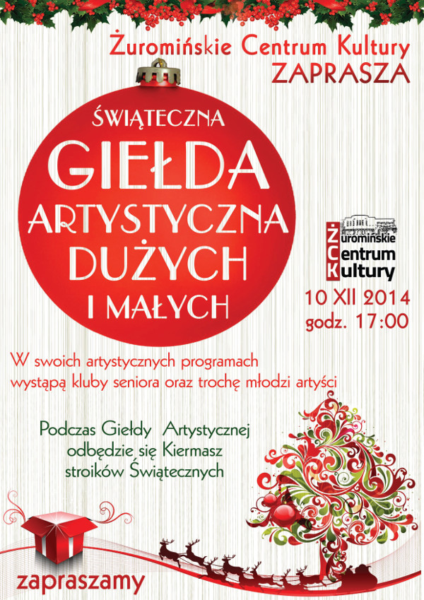 [b]Świąteczna Giełda Artystyczna[/b]W ofercie Żuromińskiego Centrum Kultury znajduje się również Świąteczna Giełda Artystyczna Dużych i Małych, która odbędzie się 10 grudnia o godzinie 17:00 w sali kinowej. Na scenie wystąpią między innymi kluby seniora i młodzież. Odbędzie się również kiermasz stroików świątecznych.