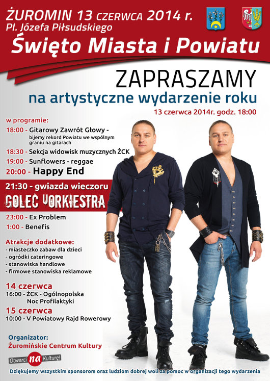 Na początku będziemy próbować pobić rekord powiatu we wspólnym graniu na gitarze. O 18:30 na scenie wystąpi sekcja widowisk muzycznych ŻCK, a o 19:00 zespół Sunflowers. Godzinę później na scenie zobaczymy zespół Happy End. Występ gwiazdy wieczoru Golec uOrkiestry zaplanowano na godzinę 21:30. Potem mieszkańcy będą mogli się bawić do późnych godzin nocnych przy muzyce zespołu Ex Problem i Benefis. Oprócz występów na scenie organizatorzy czyli Żuromińskie Centrum Kultury zapewnią atrakcje dla dzieci oraz biesiadowanie w ogródkach cateringowych.