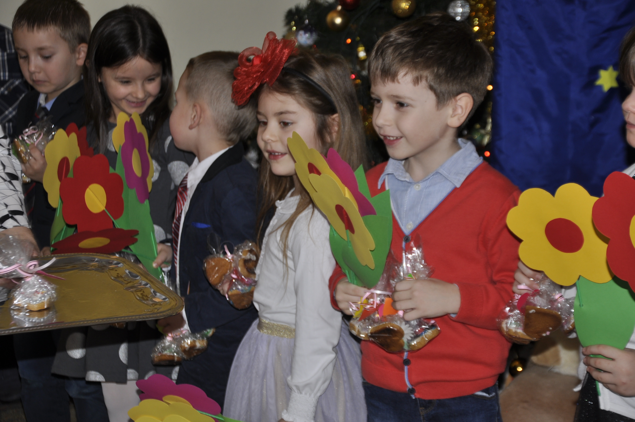 Grupa pięciolatków – najstarsza grupa z Samorządowego Przedszkola nr 1 w Żurominie gościła swoich gości honorowych – babcie i dziadków w czwartek 21 stycznia. Wszyscy zebrani goście od godziny 10:00 mogli podziwiać występy małych aktorów. Dzieci wraz ze swoją wychowawczynią p. Joanna Bukowską wystawiły na przedszkolnej scenie specjalnie dla licznie zgromadzonych babć i dziadków świąteczne jasełka oraz zaprezentowały krótki występ artystyczny. Recytowały wiersze oraz śpiewały piosenki przy muzycznym akompaniamencie, a w pierwszej części repertuaru przypomniały, jak to było z narodzeniem Jezusa. W przerwie, podczas której dzieci zmieniały stroje, zebrani goście zaśpiewali wspólnie kolędę „Cicha noc”. W trakcie występów do przedszkola przybyli także policjanci z Ogniwa Ruchu Drogowego żuromińskiej komendy. Sierż. szt. Bogusław Kujawa oraz mł. asp. Artur Piotrowski po złożeniu życzeń babciom i dziadkom przeprowadzili krótkie zajęcia służące poprawie bezpieczeństwa pieszych poruszających się na drogach oraz przestrzegli o nowej metodzie wyłudzania pieniędzy od starszych ludzi. Po części oficjalnej przedszkolaki z żuromińskiego przedszkola wręczyli babciom i dziadkom własnoręcznie przyozdobione wcześniej pierniki oraz kolorowe kwiaty, po czym wszyscy zasiedli do przygotowanego poczęstunku – kawy, herbaty i ciasta. Dzieci oczywiście na kolanach swoich dziadków, których Ci nie mogli wypuścić z rąk w podziękowaniu za zaangażowanie i przygotowanie występu specjalnie dla nich z okazji ich święta.